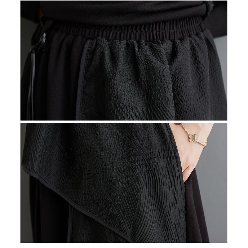 異素材のレイヤードやアシンメトリーなシルエットが際立つ、個性派セットアップ。