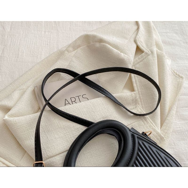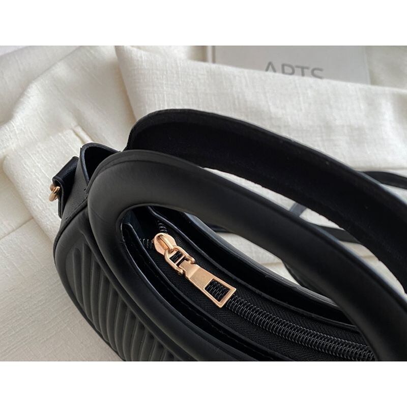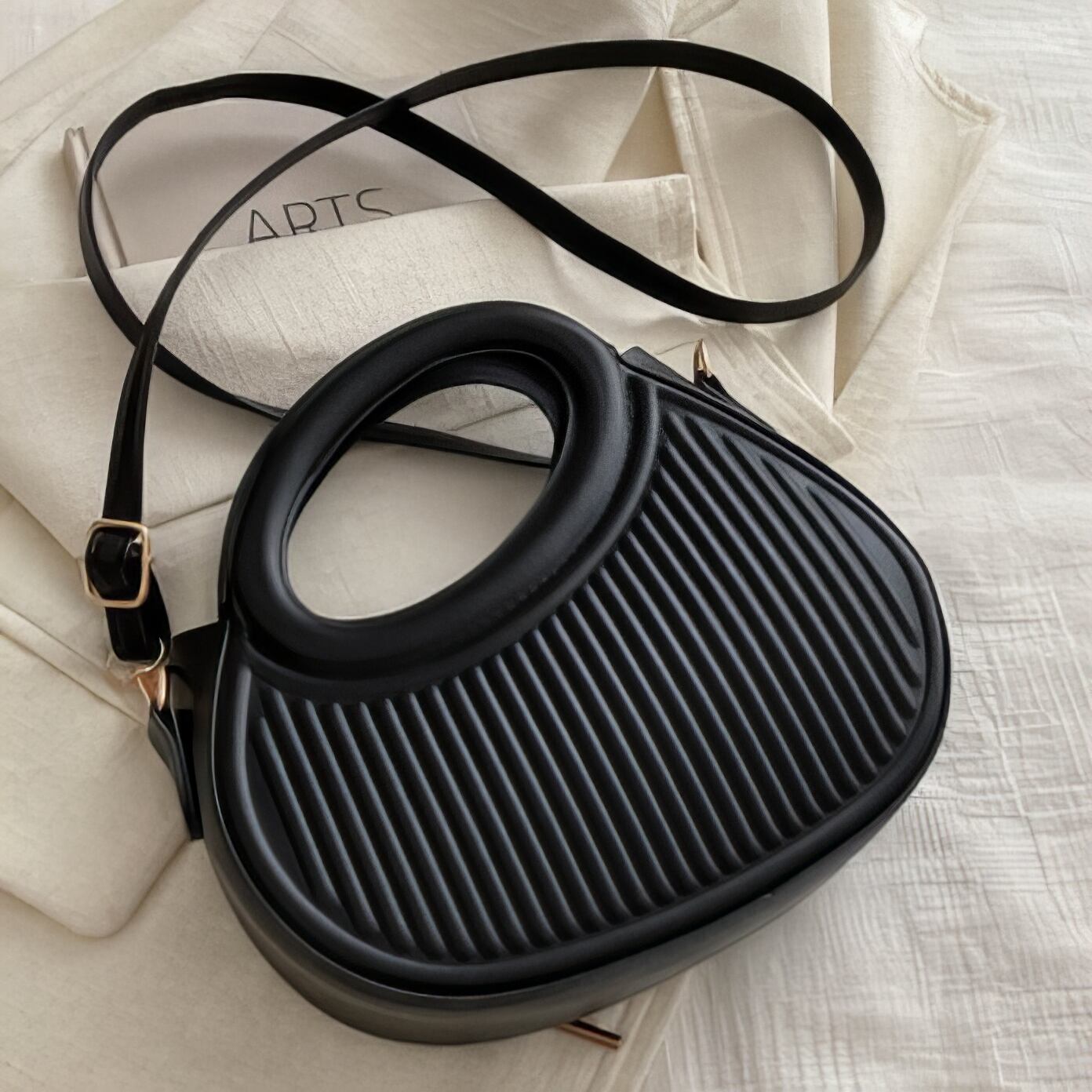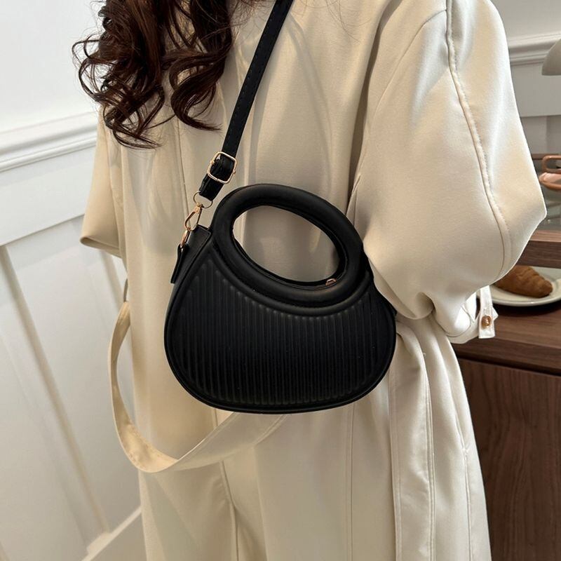 三日月のような曲線と中空ハンドルが目を引く、モダンなショルダーバッグ。