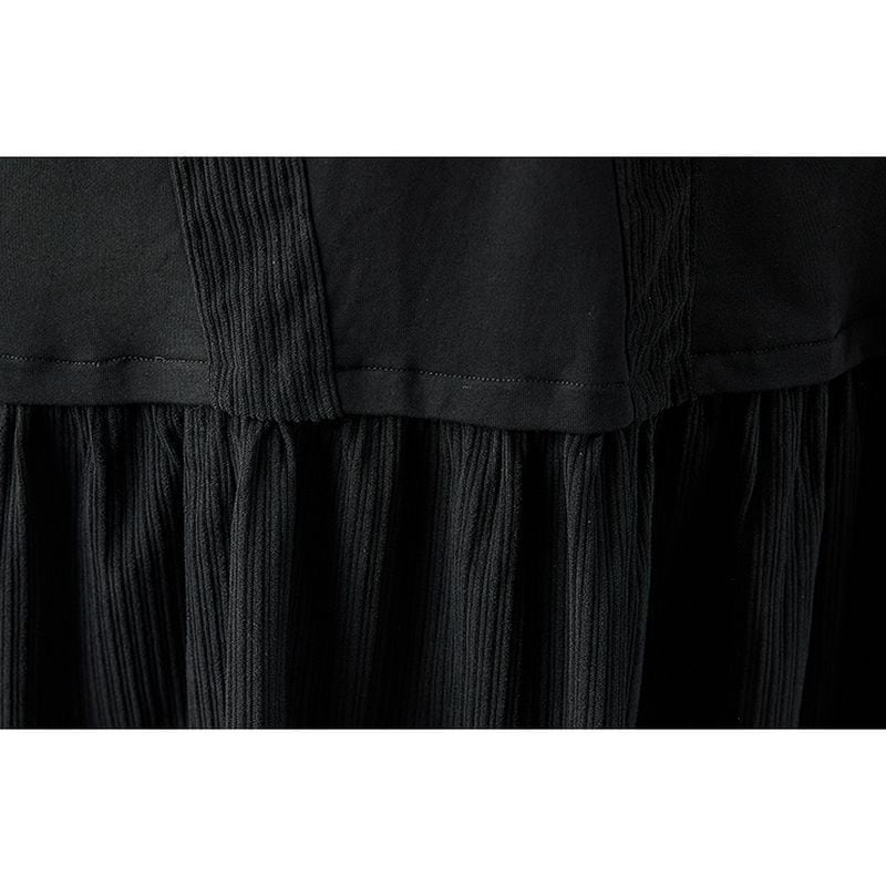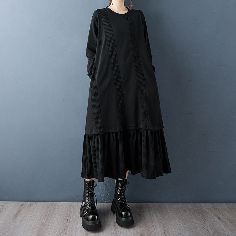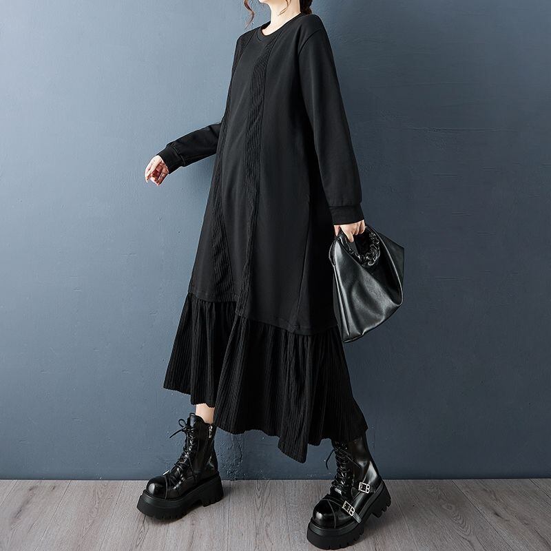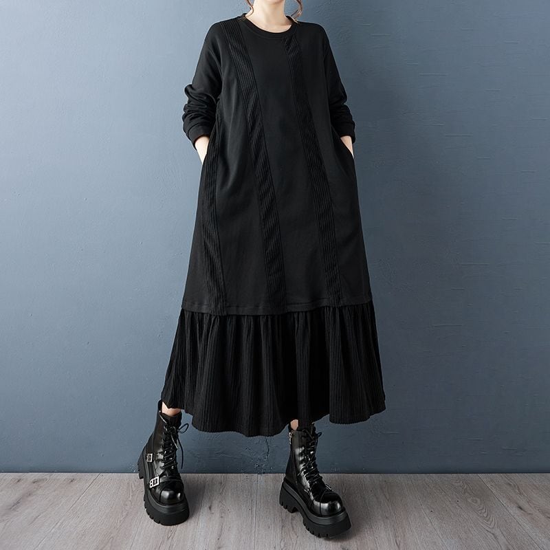 縦ラインの切り替えとプリーツ調のスカートが、すっきりとした印象を生むロングワンピース。