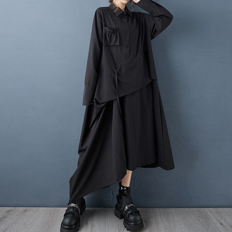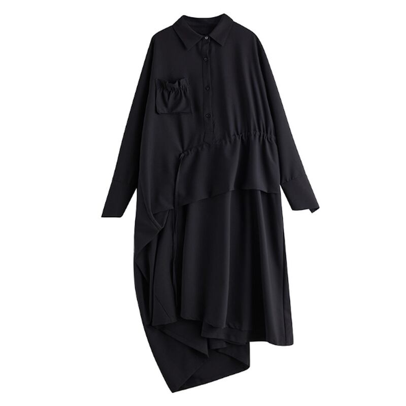 ゆったりとしたオーバーサイズシルエットに、アシンメトリーなヘムラインが映えるシャツワンピース。