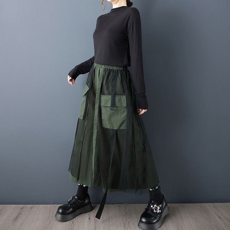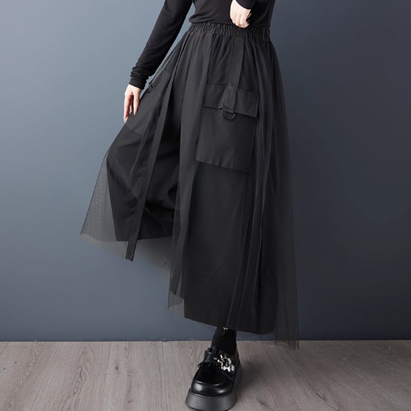 透け感のあるチュールが軽やかさを演出しつつ、カーゴディテールがストリートなムードをプラス。