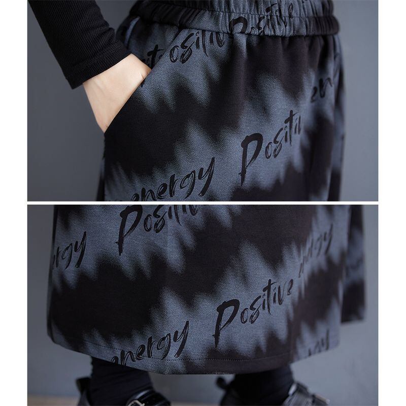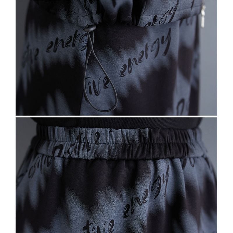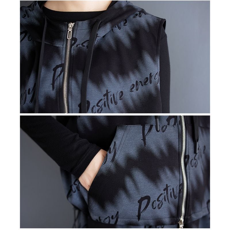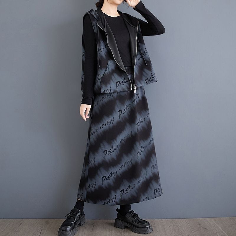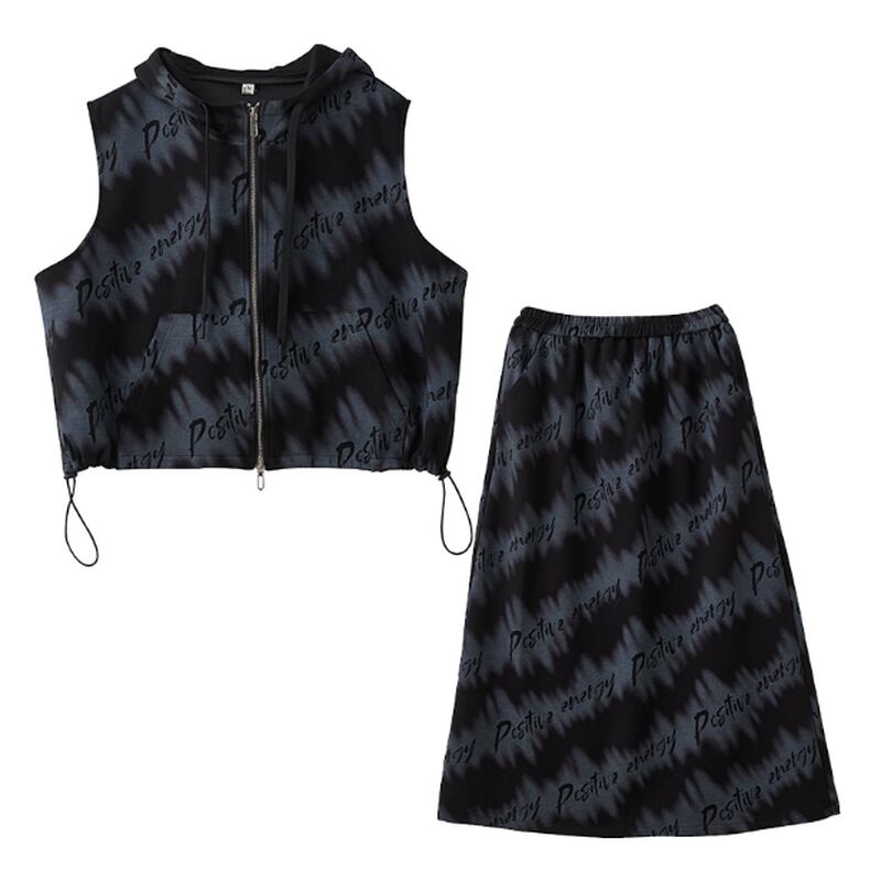 フード付きノースリーブベストとAラインロングスカートのセットアップ。
