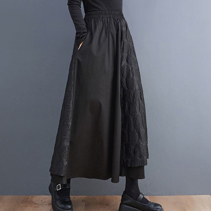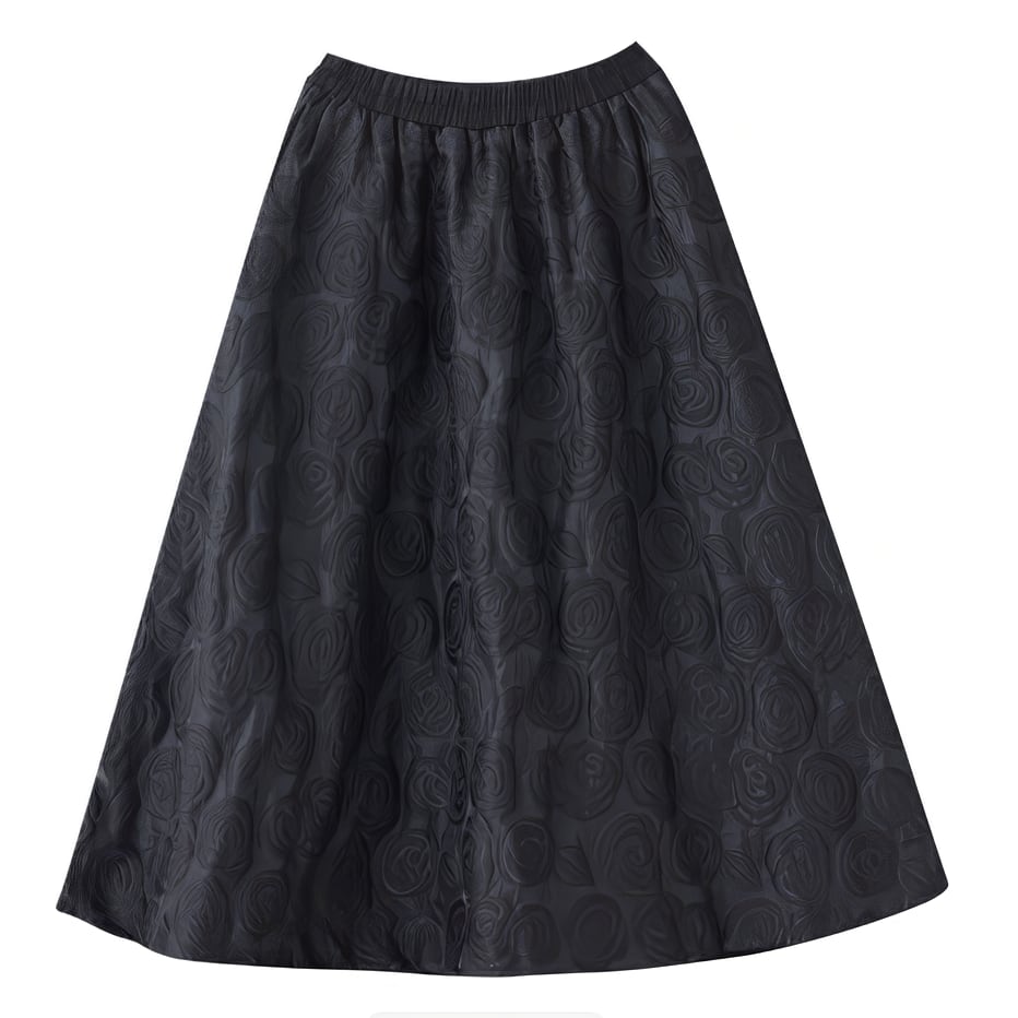 大胆な切り替えとローズモチーフの装飾が印象的なロングスカート。