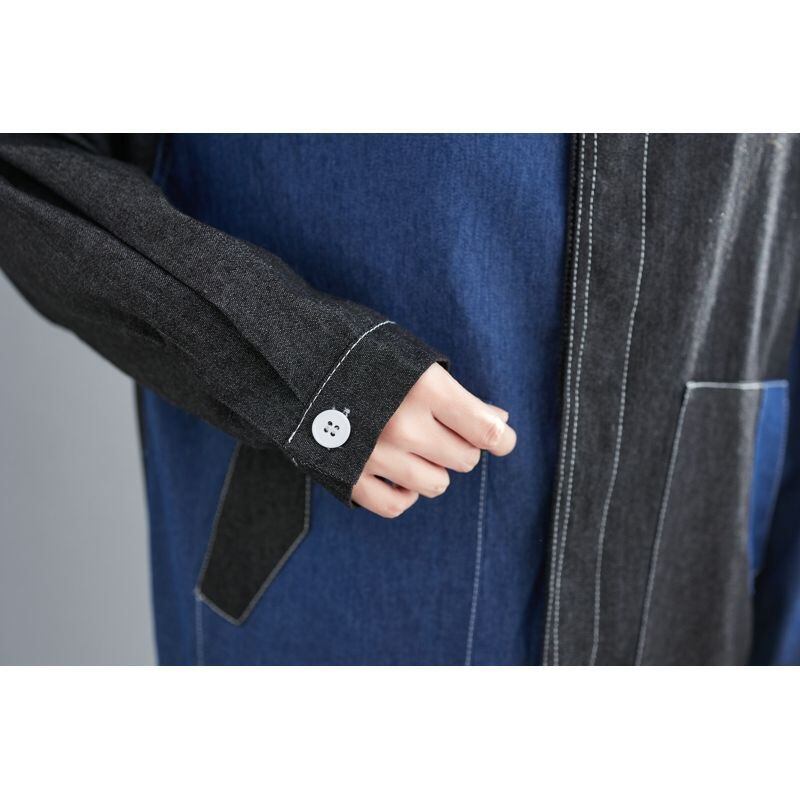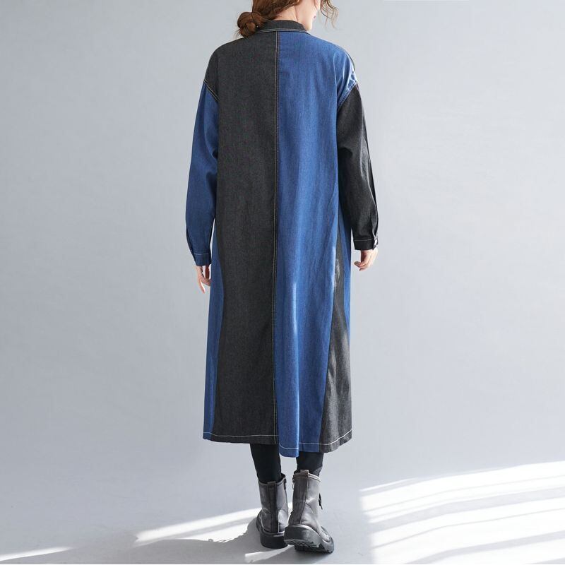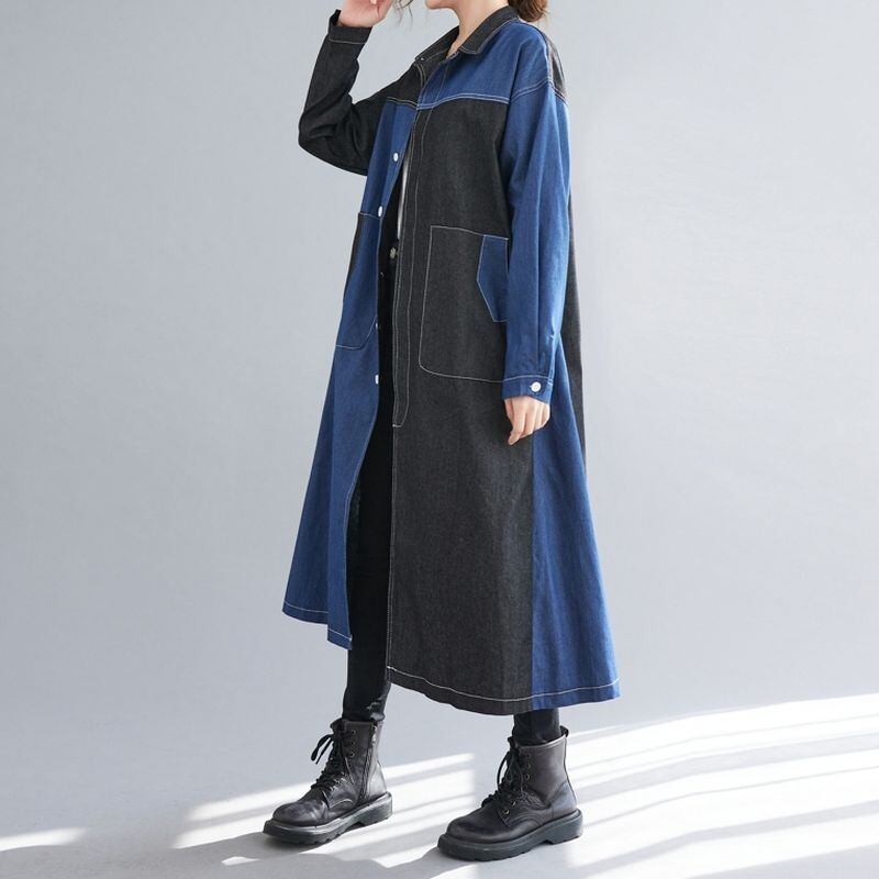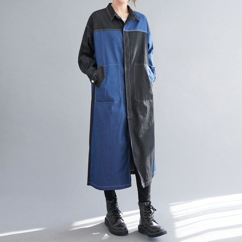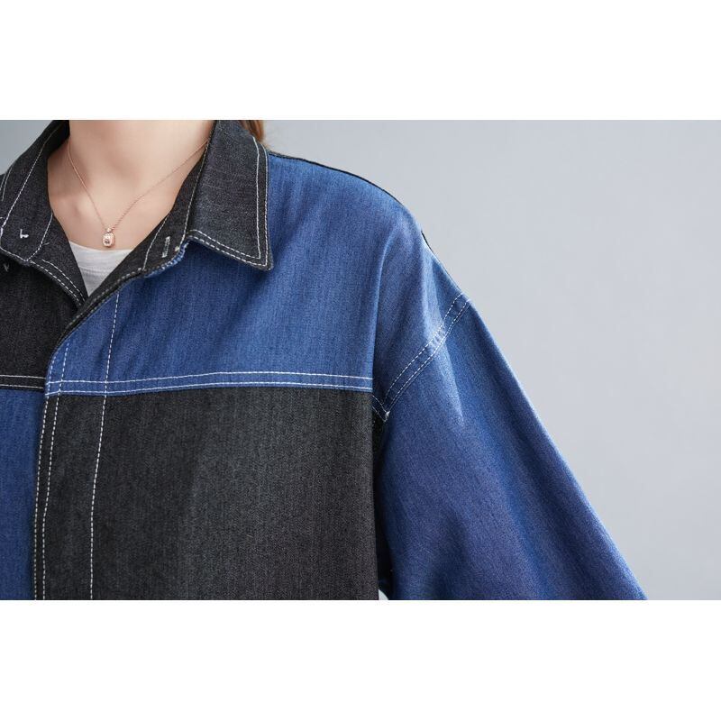 大胆なカラーブロックが目を引くデニムロングシャツ。