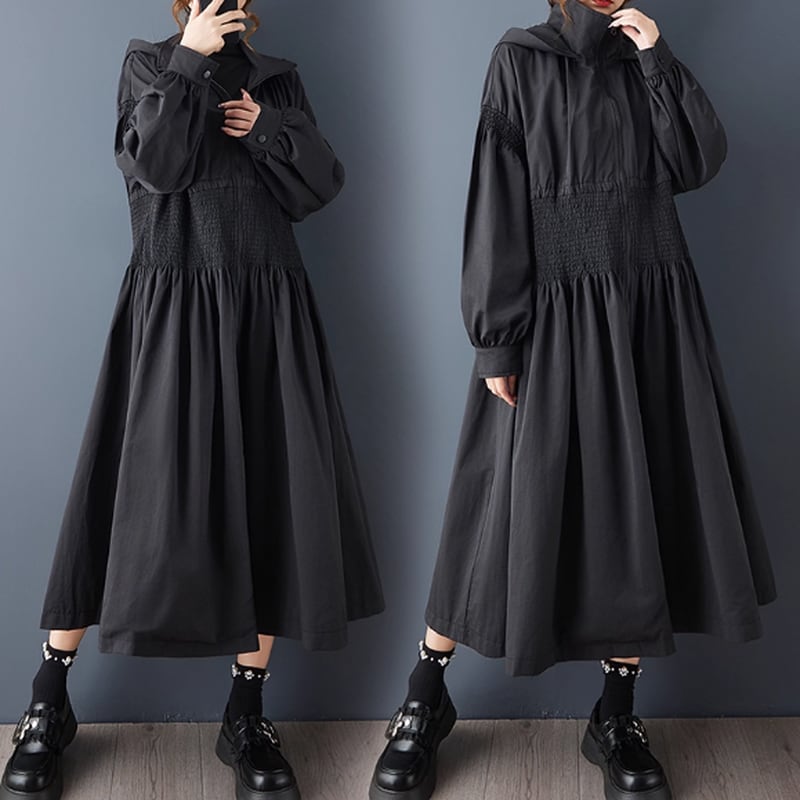 フードとボリューム袖がポイントのロング丈パーカー。
