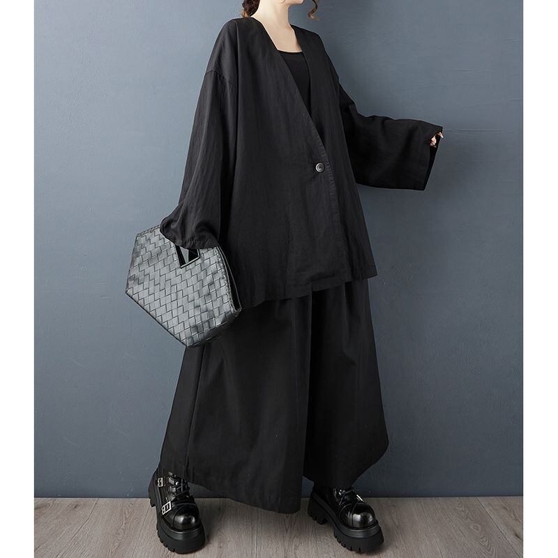 深めのVネックとワイドな袖が印象的なジャケット。