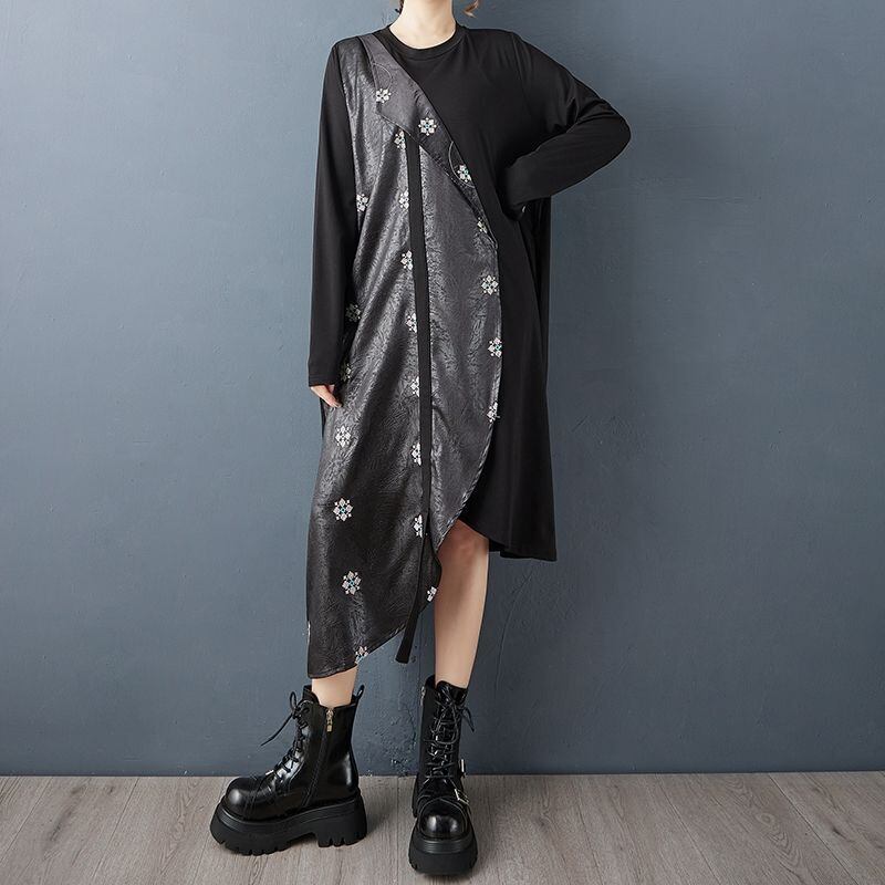 このアイテムは、ブラックを基調とした長袖ロングワンピース。