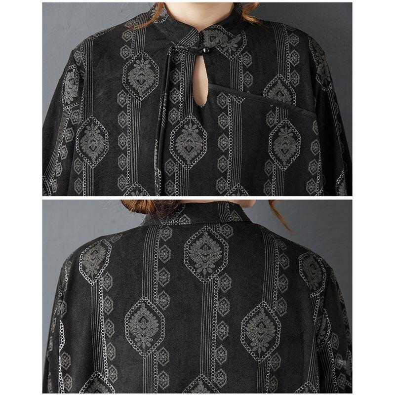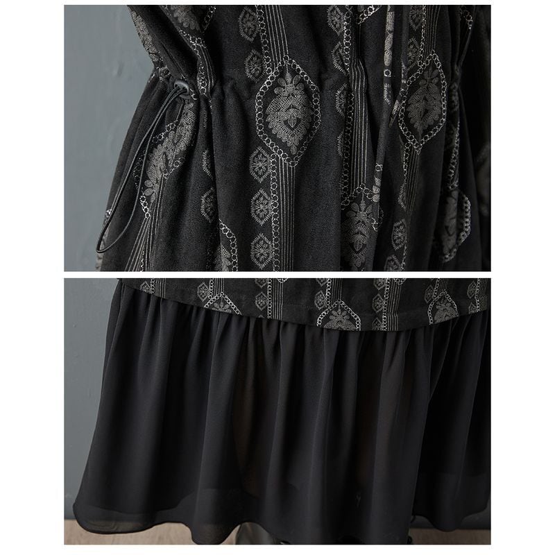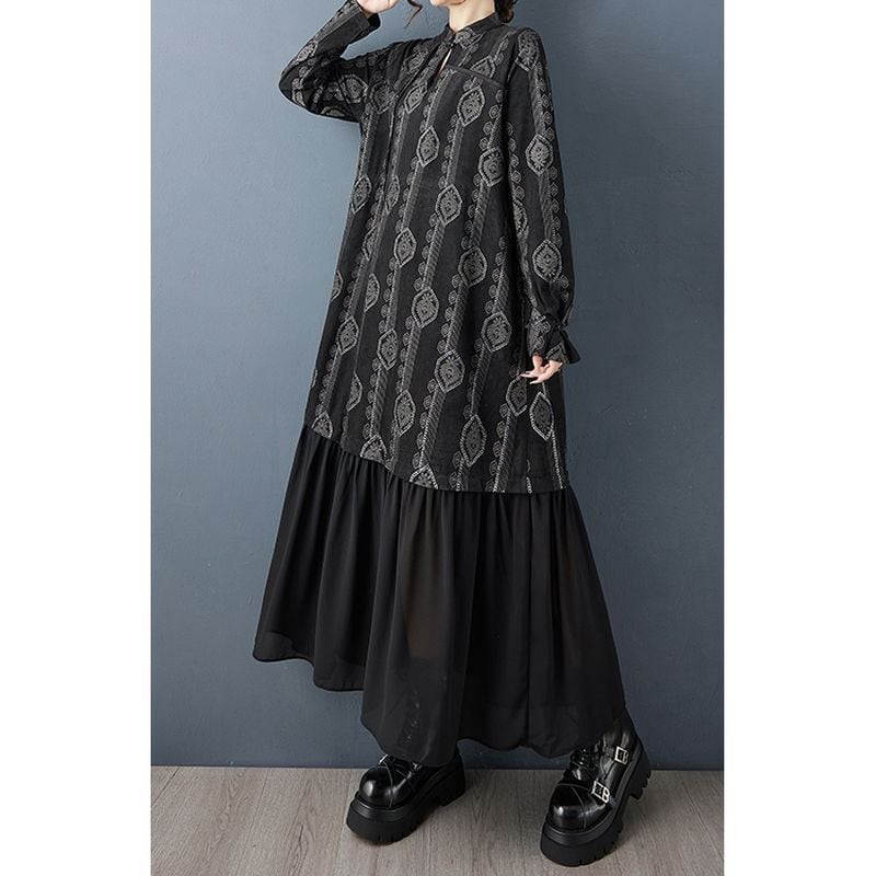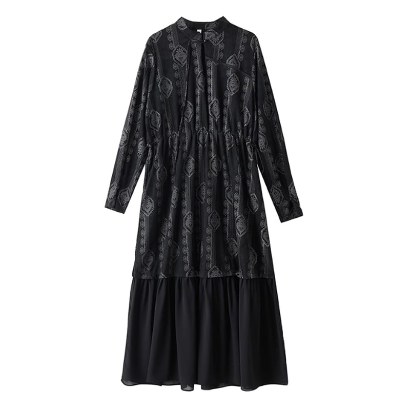オリエンタルな柄が目を引く、ブラックベースのロングワンピース。