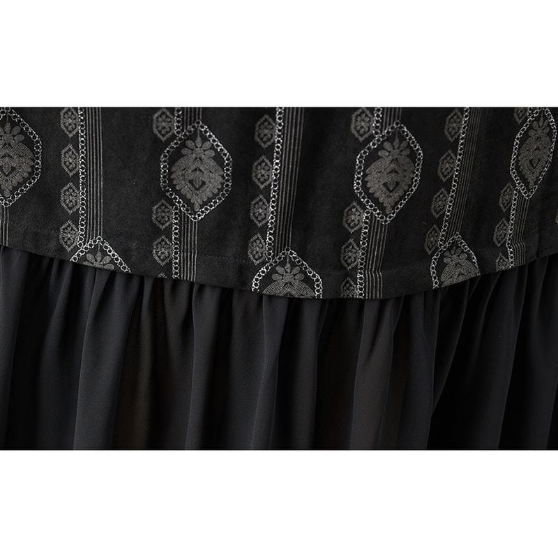 上身頃に施された装飾的な模様と、裾の無地ティアードが美しいコントラストを描きます。