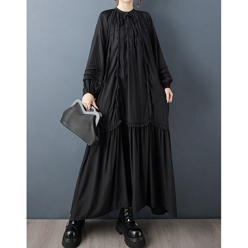 ギャザーをあしらった長袖マキシ丈ワンピース。