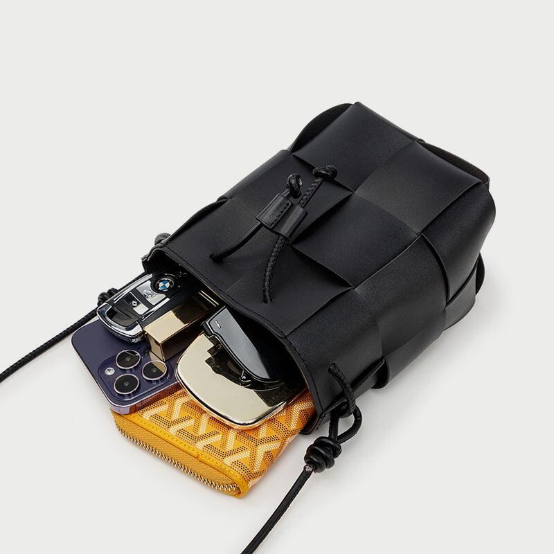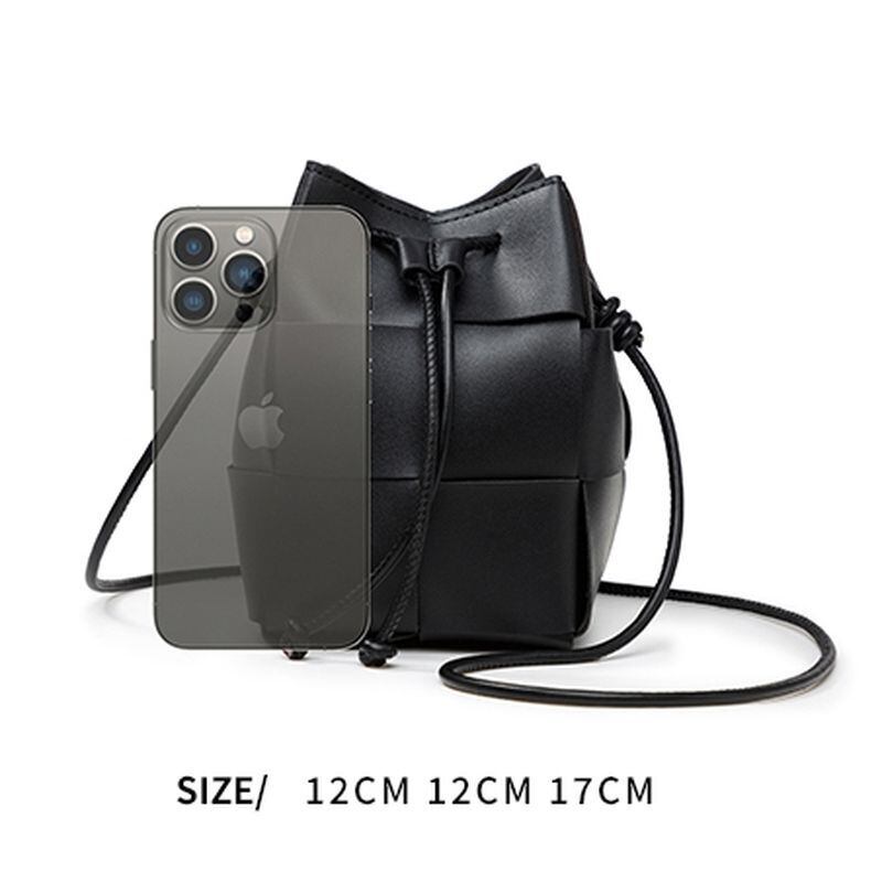 編み込みデザインが目を惹く、立体フォルムのミニバケットバッグ。