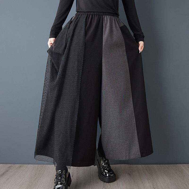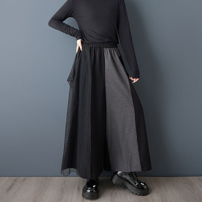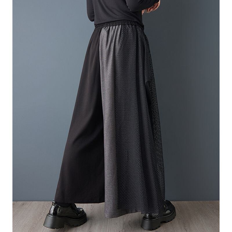 大胆な異素材ミックスが印象的なワイドパンツ。