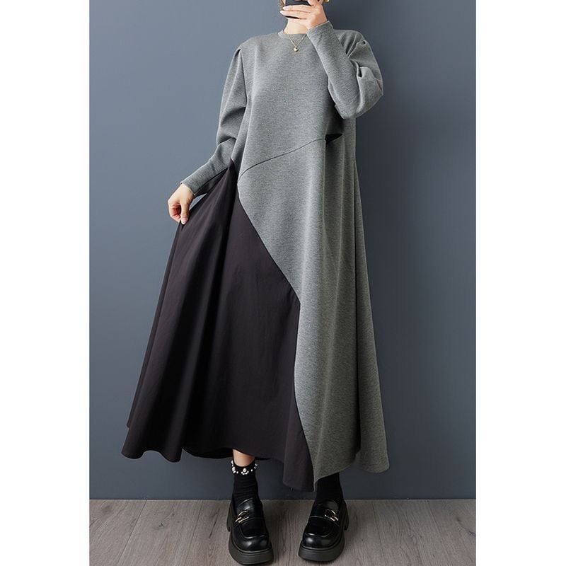 斜めの切り替えラインが印象的な、アート感漂うロングワンピース。