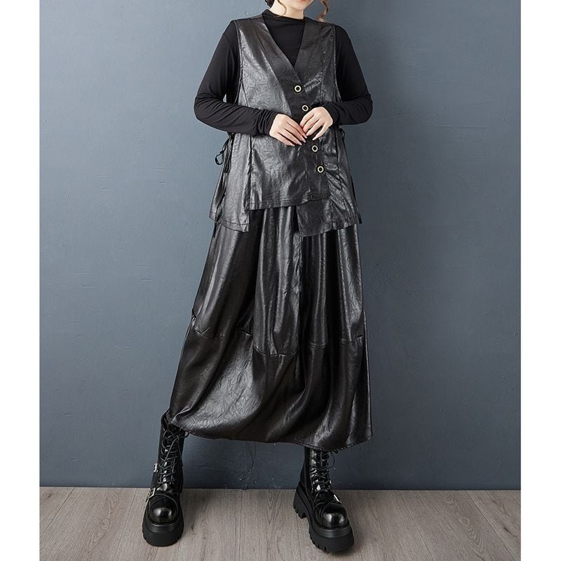 Vネックベストとボリュームスカートが、ワンピースのような一体感を演出。