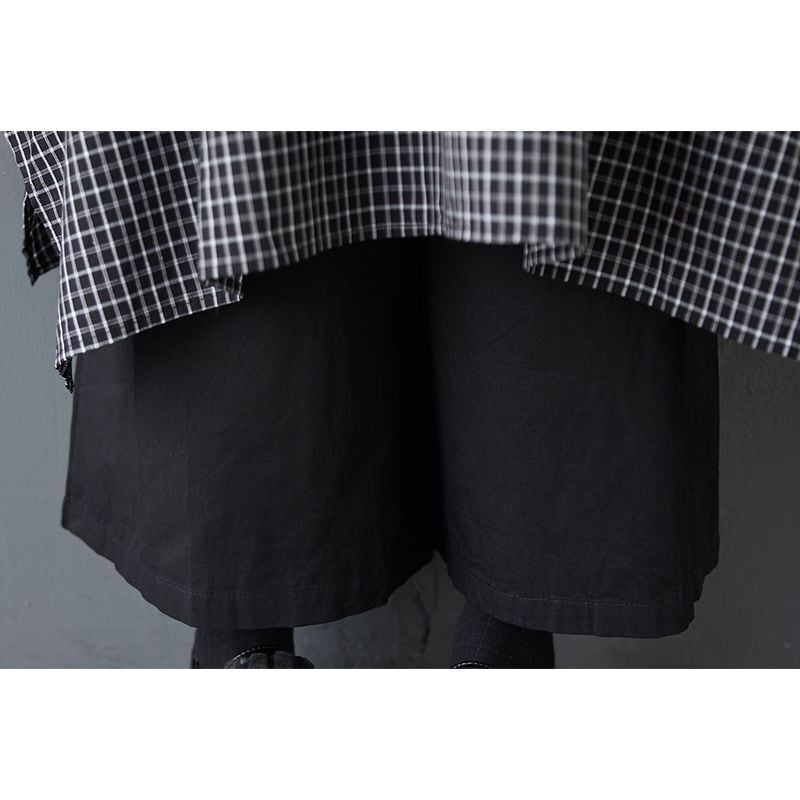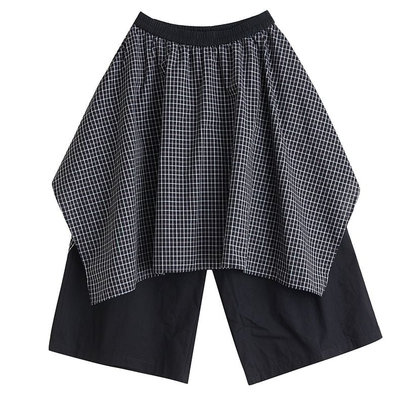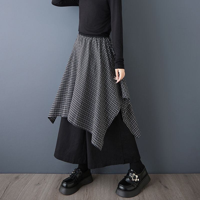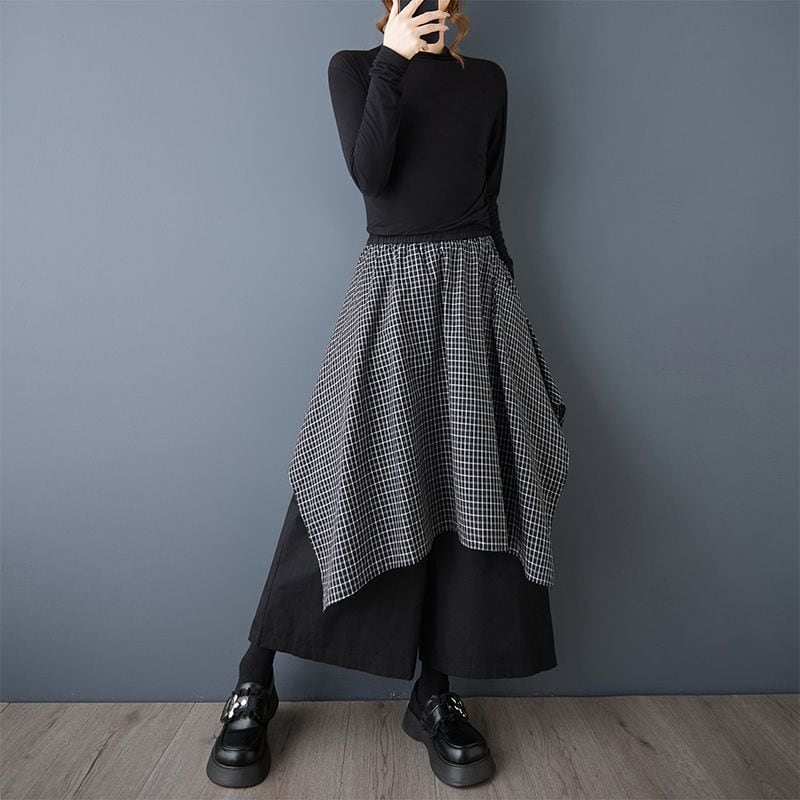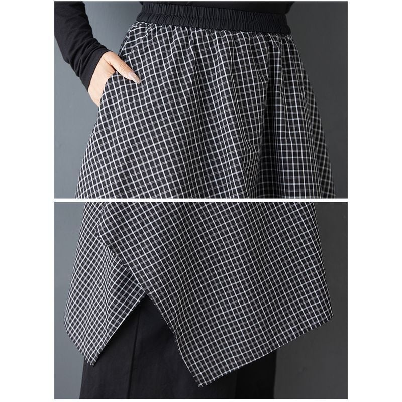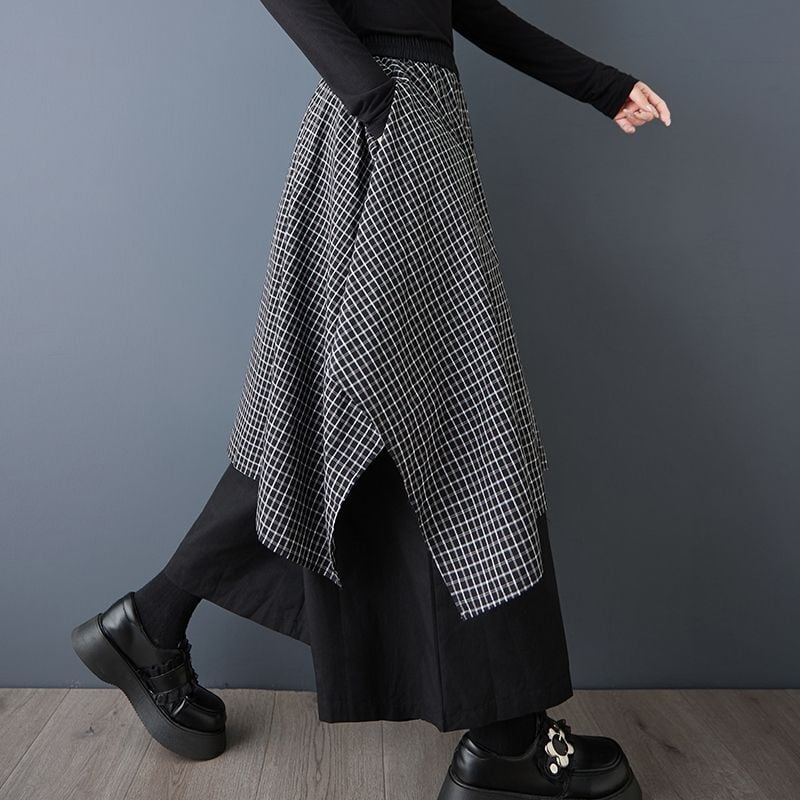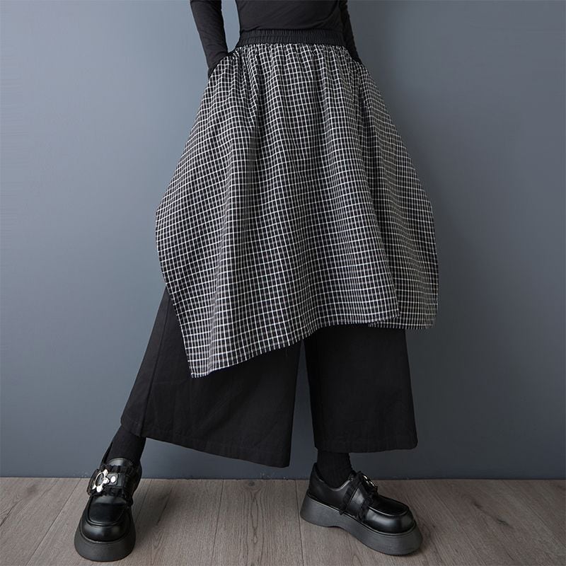 チェック柄スカートに黒のパンツを重ねたような、モード感漂うレイヤードデザイン。