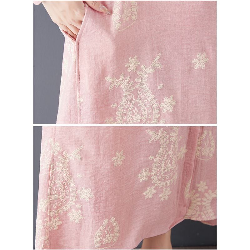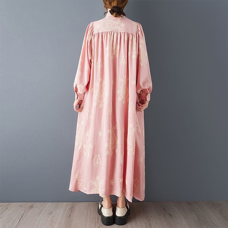 繊細な刺繍が全面に施された、上品で華やかなピンクのロングワンピース。