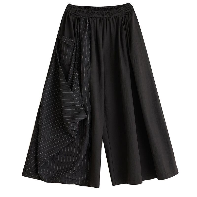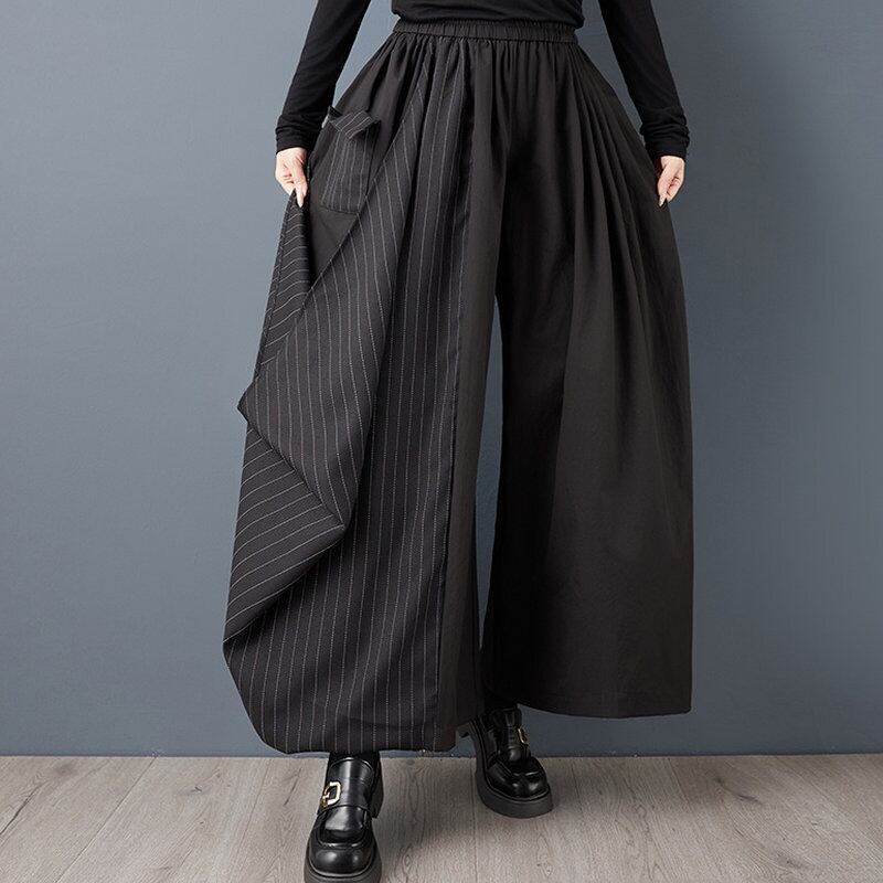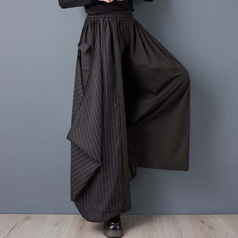 左右で異なる素材とラインが印象的な、アシンメトリーデザインのワイドパンツ。