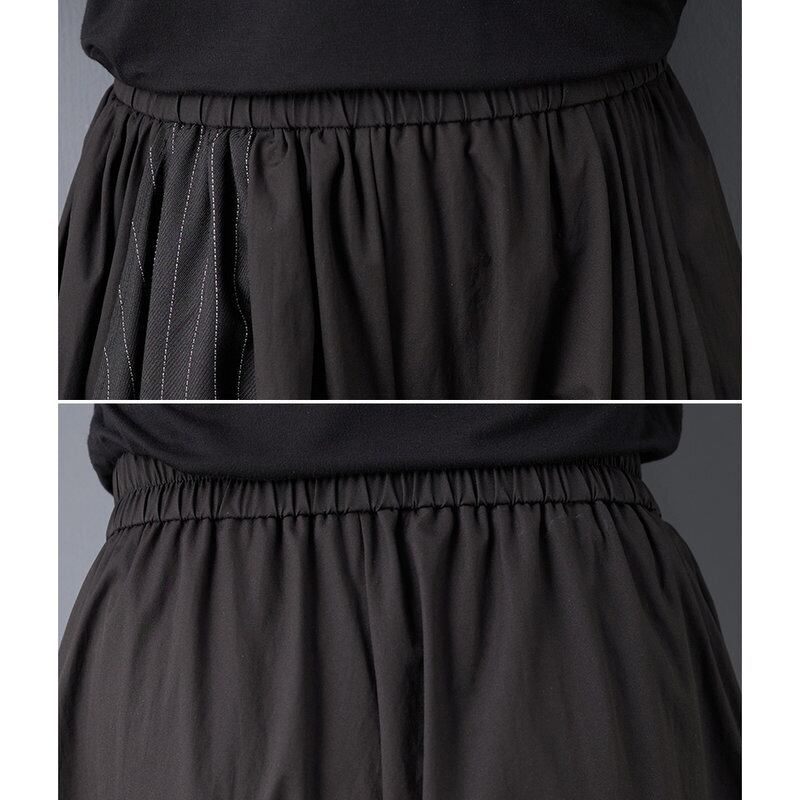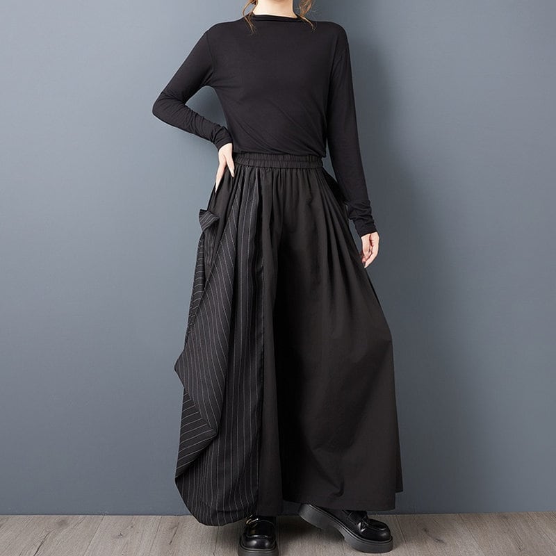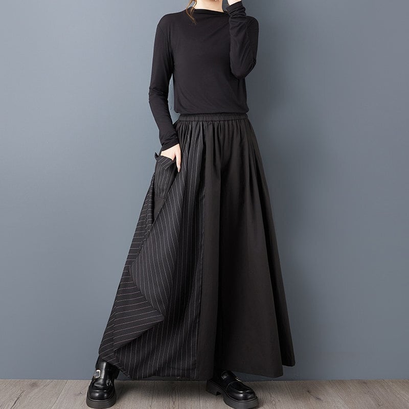 無地×ストライプの大胆な切り替えが、シンプルなトップスを合わせるだけでモードな雰囲気に。