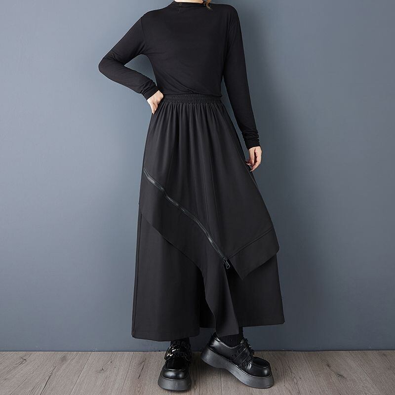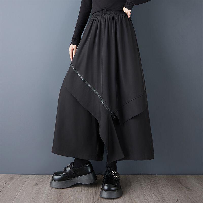 斜めに走るジップと、重なり合うレイヤーが印象的なデザインパンツ。