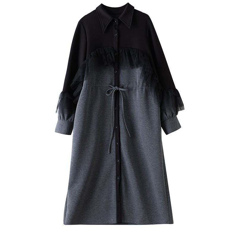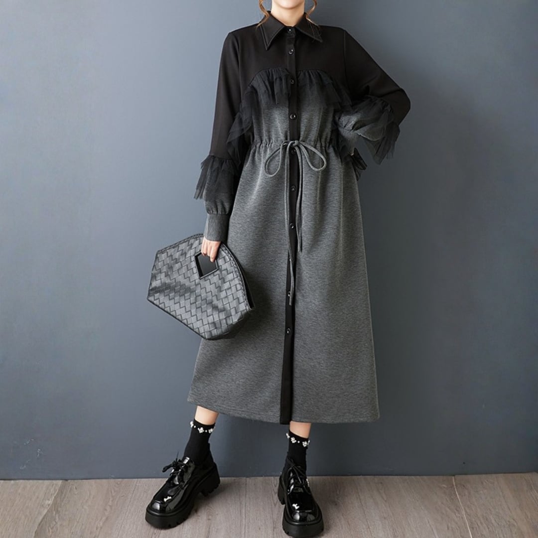 異素材を組み合わせたバイカラーデザインのロングシャツワンピース。
