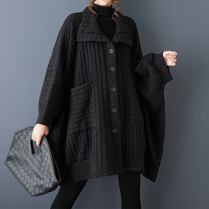 ゆったりとしたシルエットと大きめの襟が、上品な存在感を演出します。