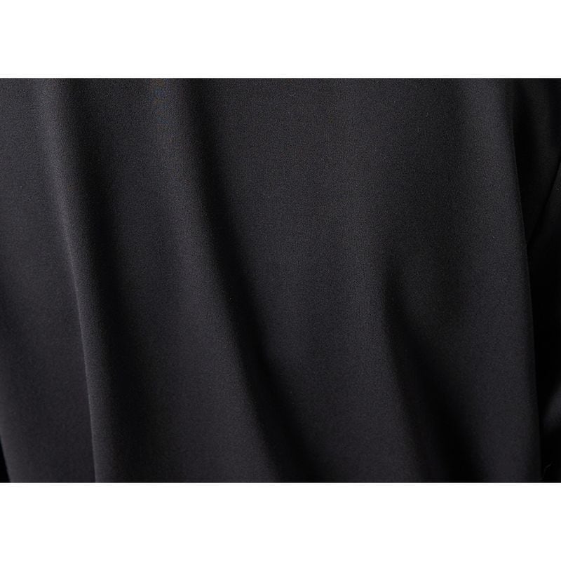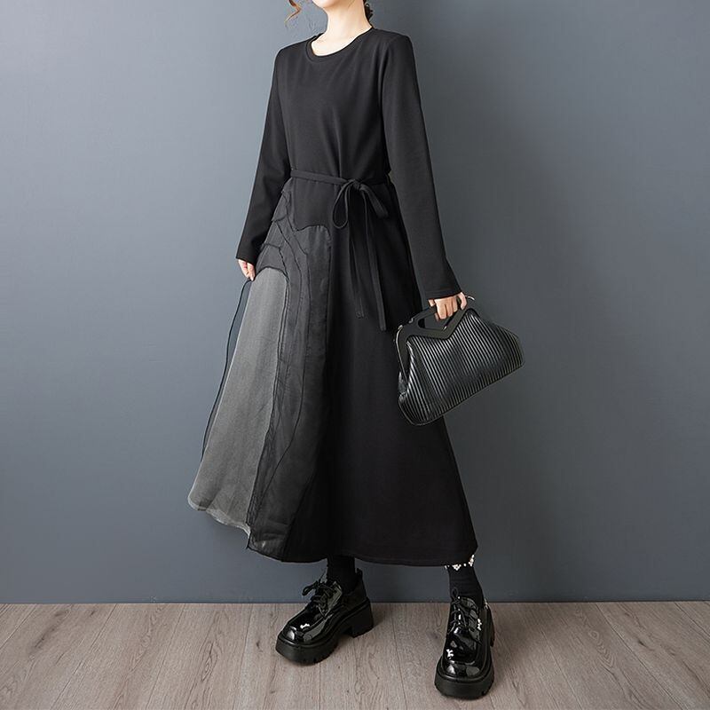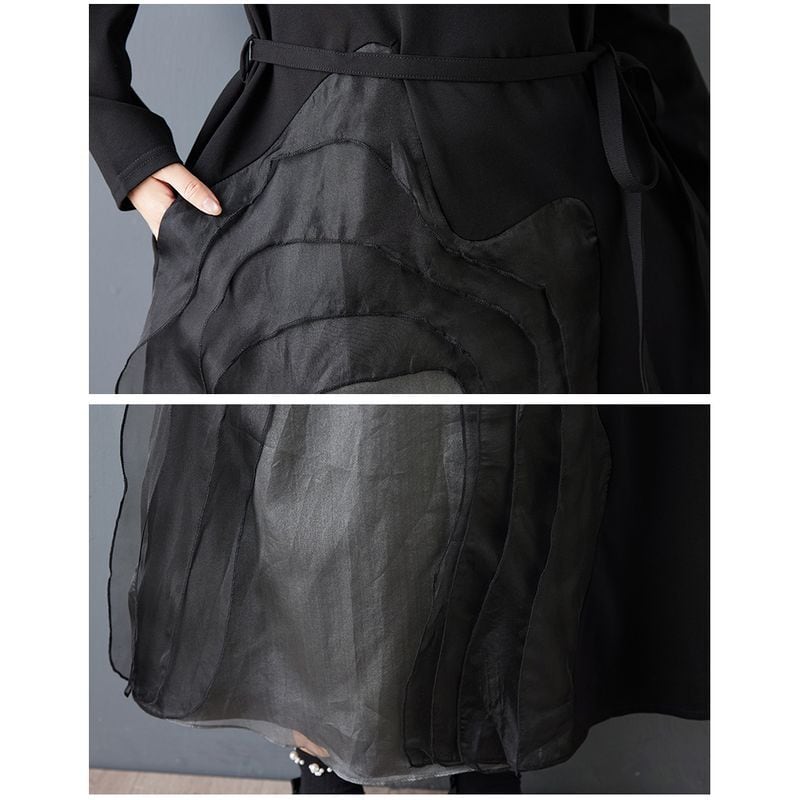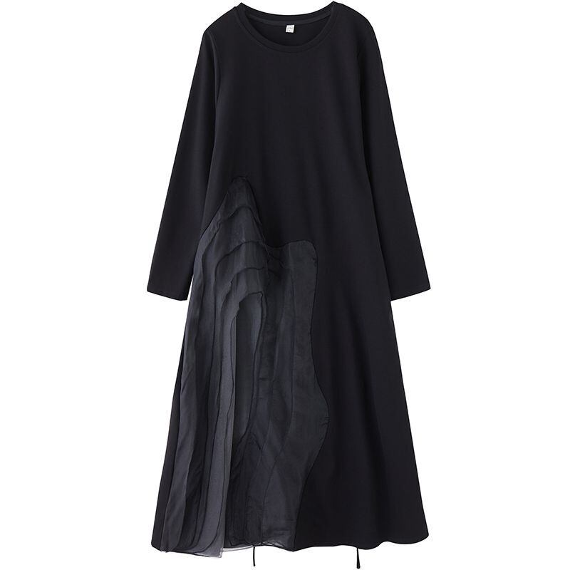 大胆な異素材切替が目を惹く、洗練された印象のブラックワンピース。