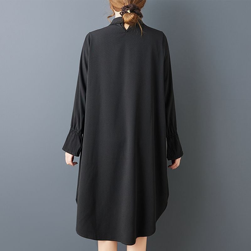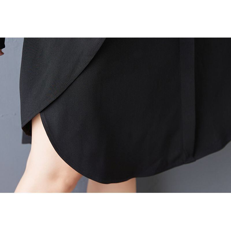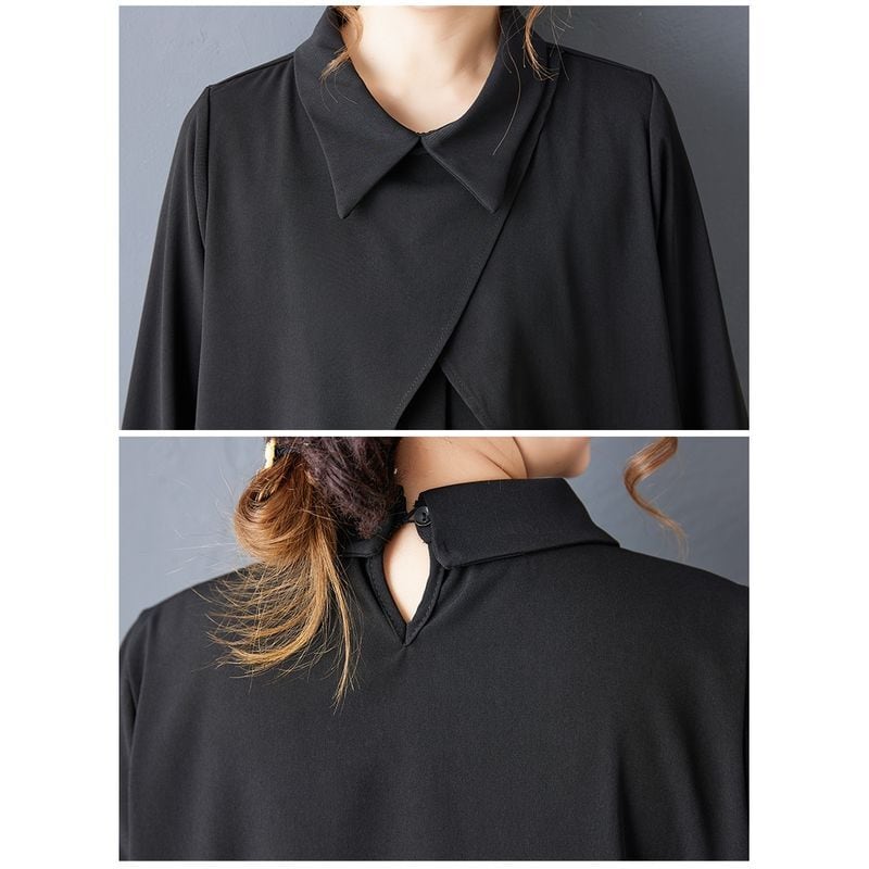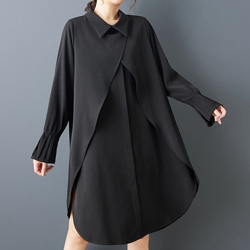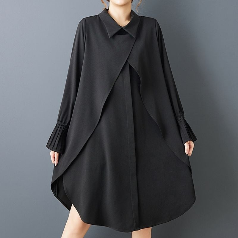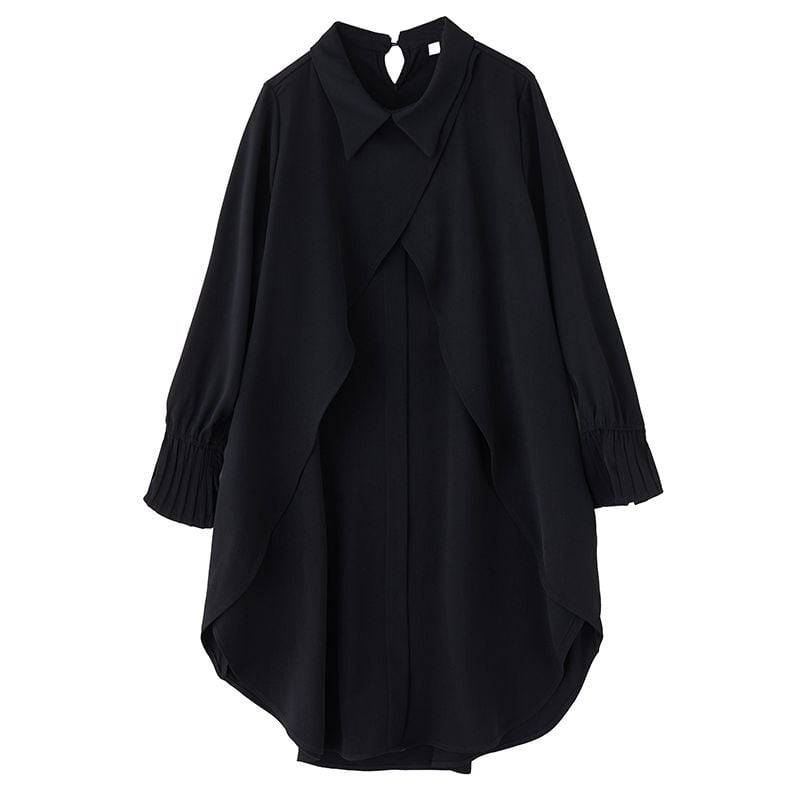 アシンメトリーな前身頃のレイヤードが印象的な、洗練度の高いブラックチュニック。