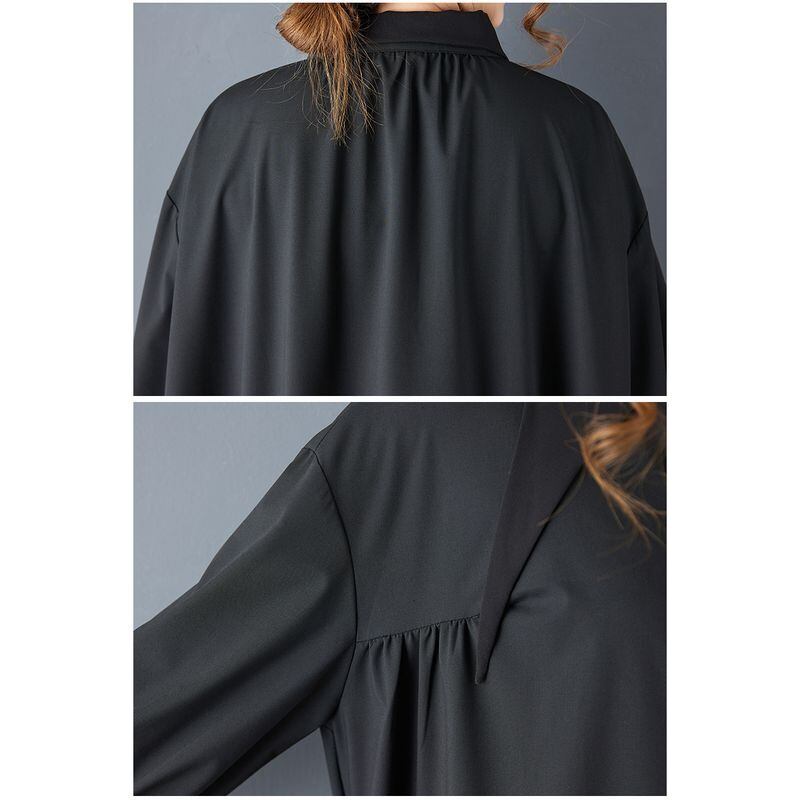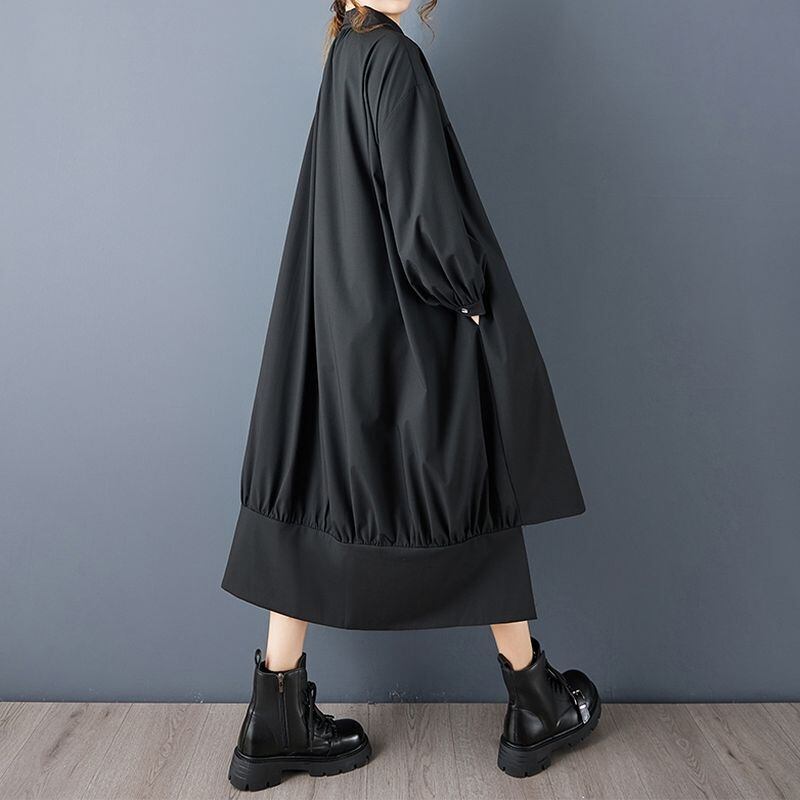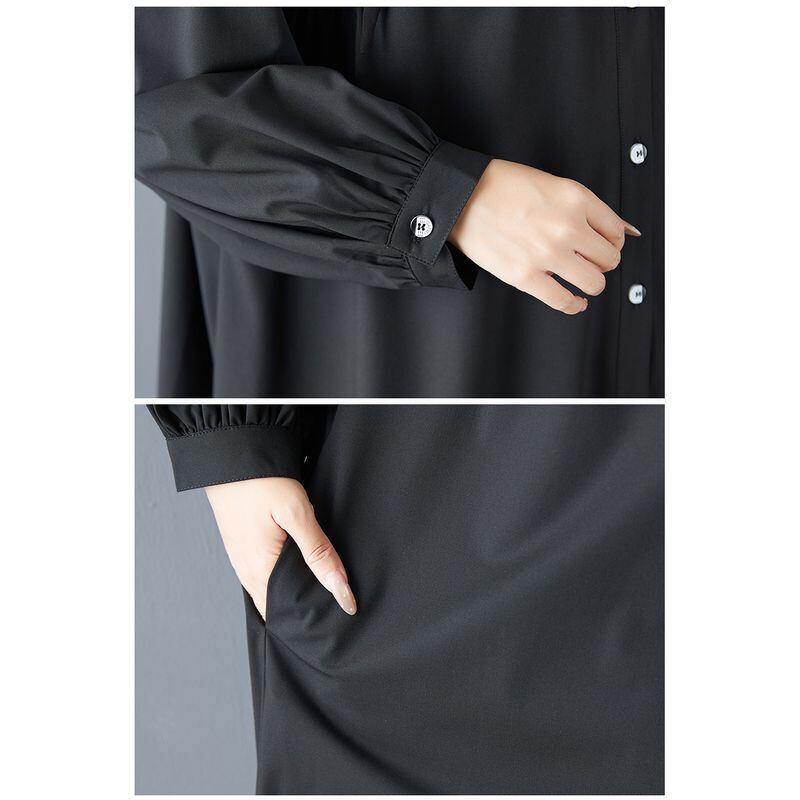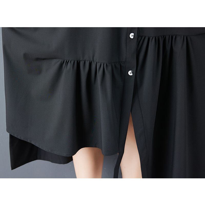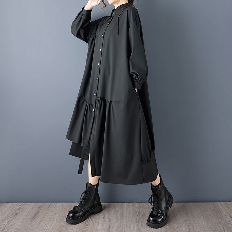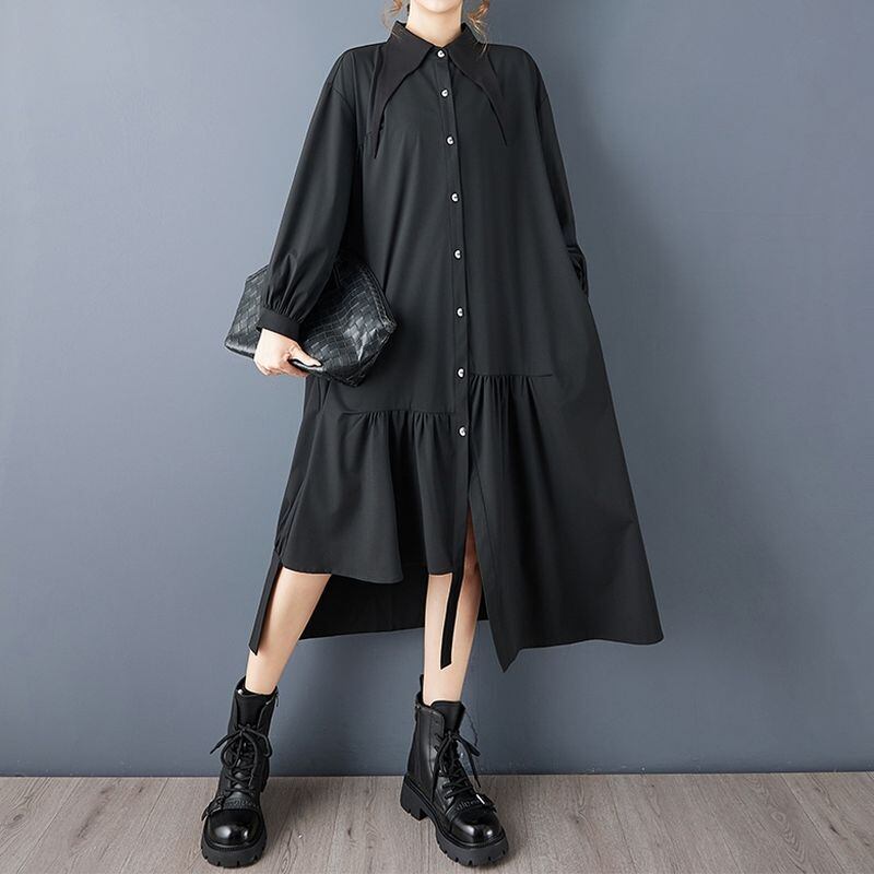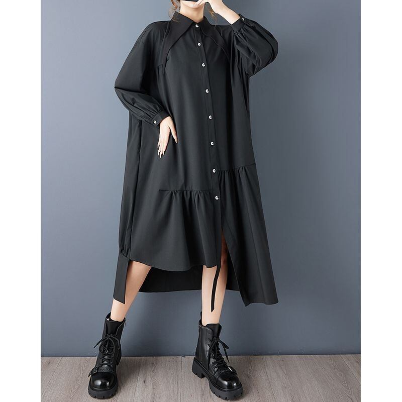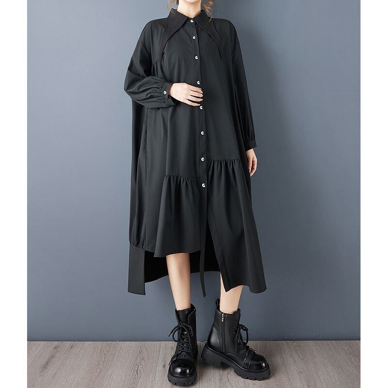 クラシックなシャツワンピースに、変形デザインの襟とアシンメトリーな裾を組み合わせた一枚。