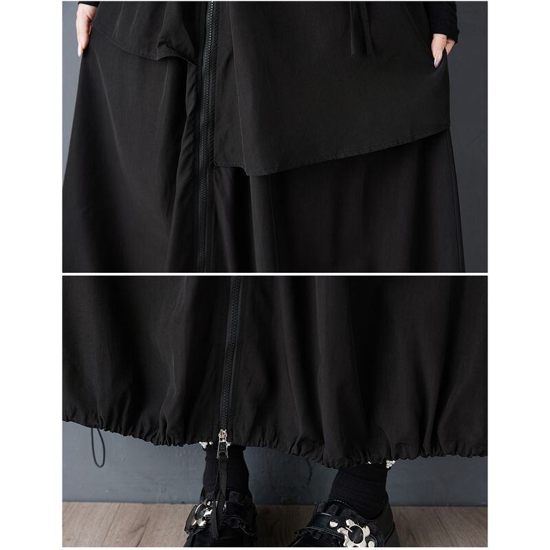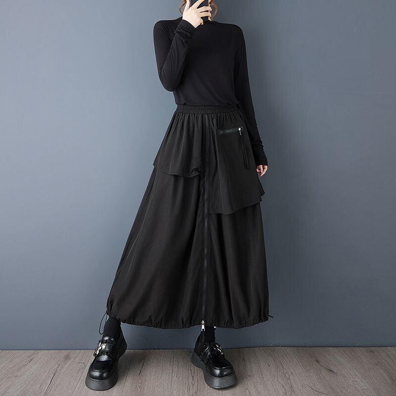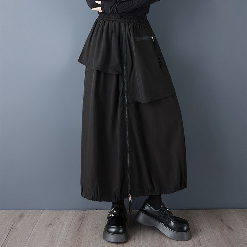 アシンメトリーなレイヤードとジップを組み合わせた、存在感のあるロングスカート。