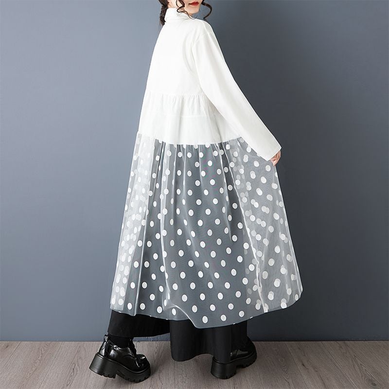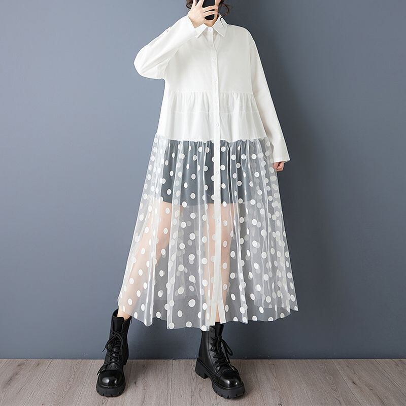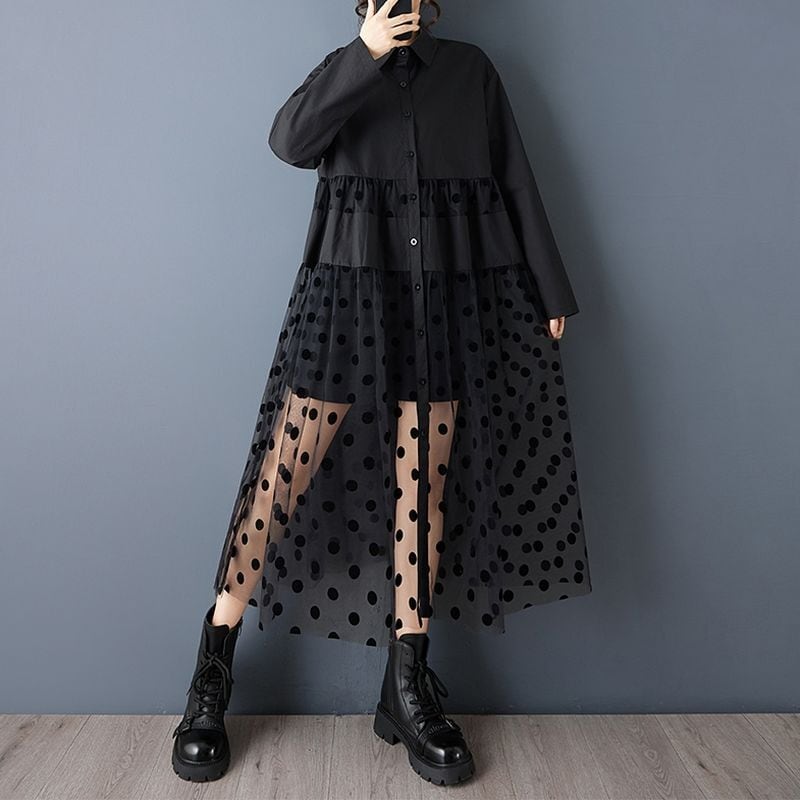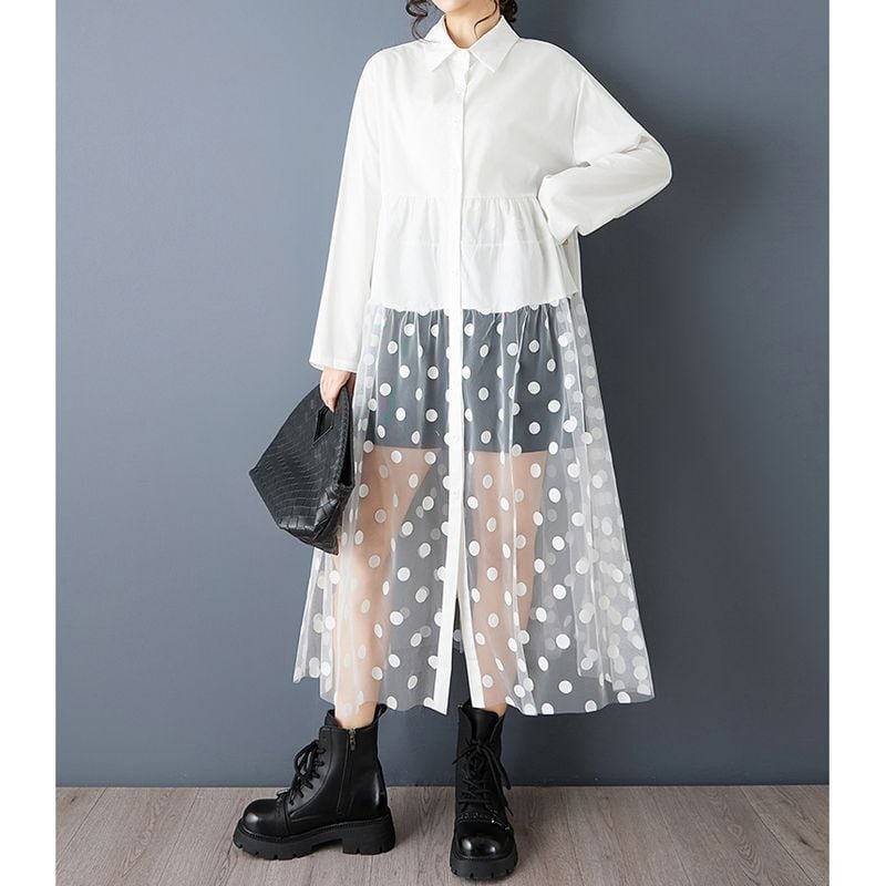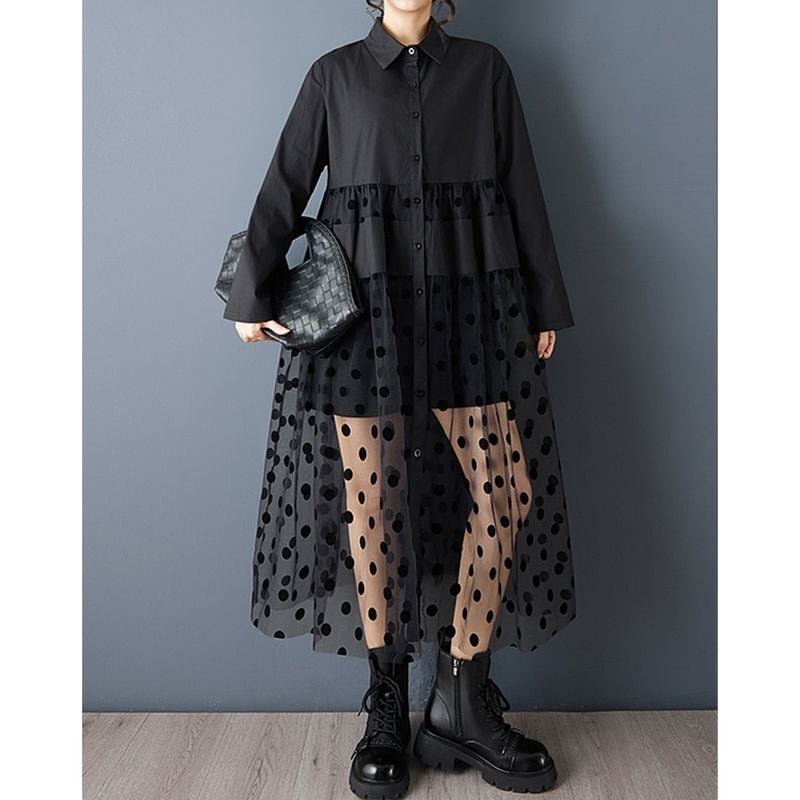 異素材の組み合わせが目を引く、ドット柄シースルーの切替ワンピース。