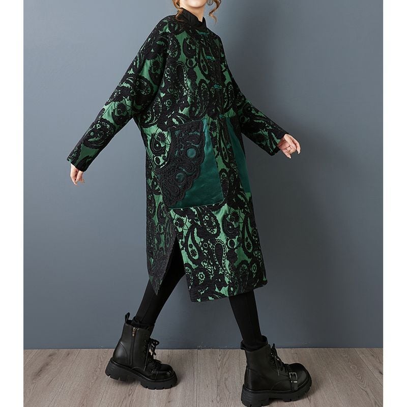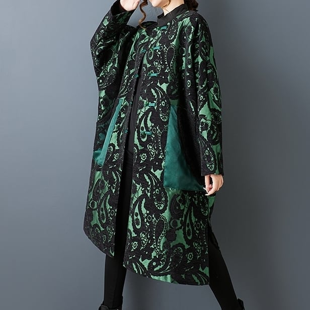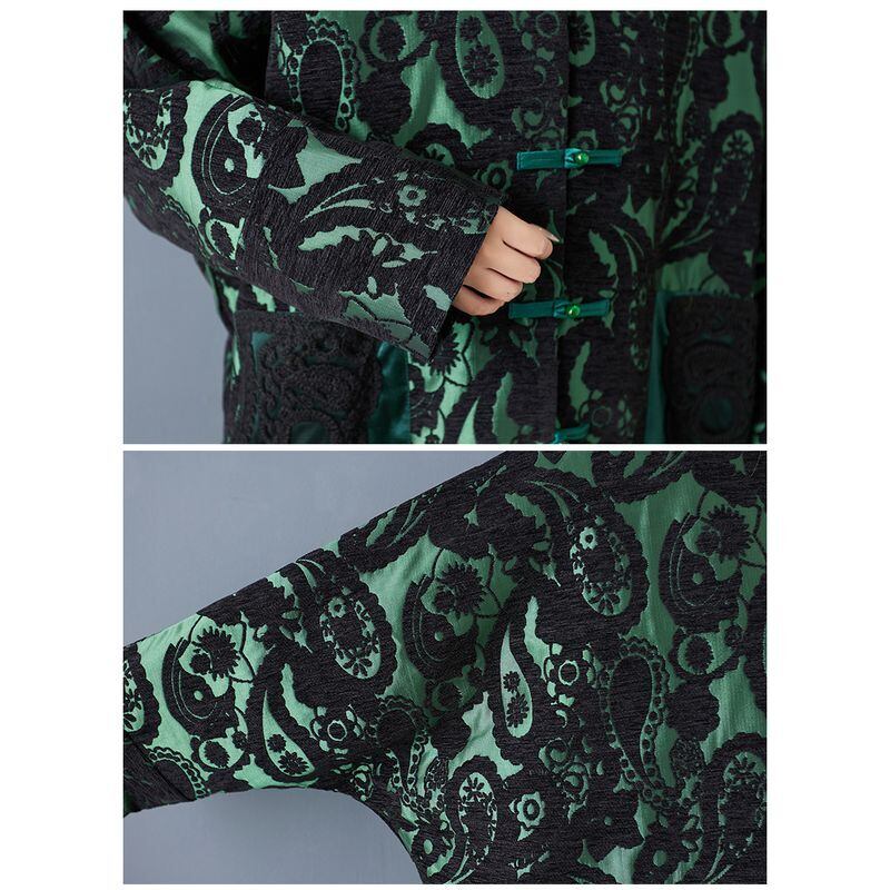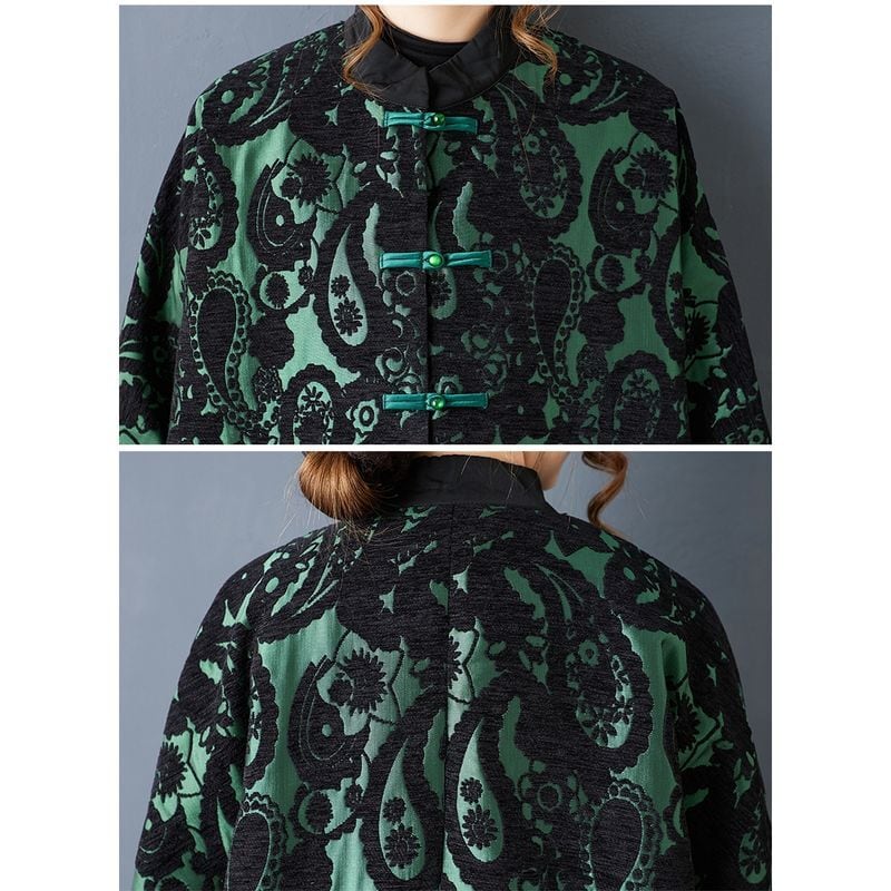 大胆なペイズリー柄とオリエンタルなチャイナボタンが印象的なコート。