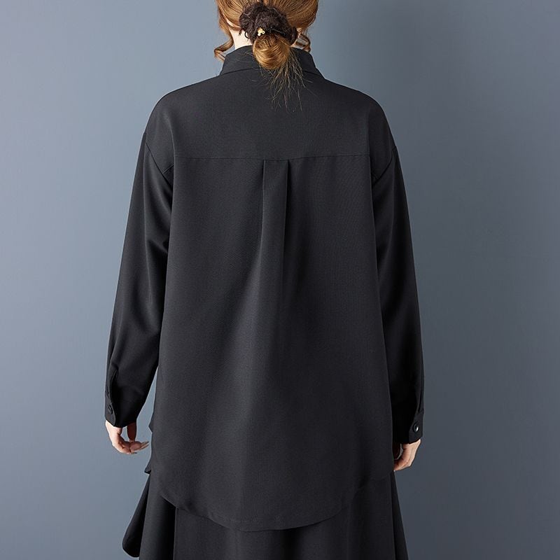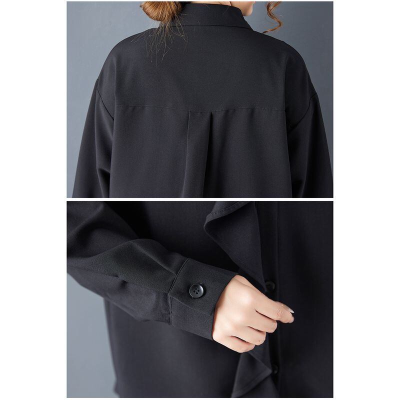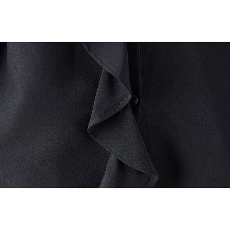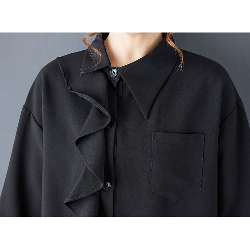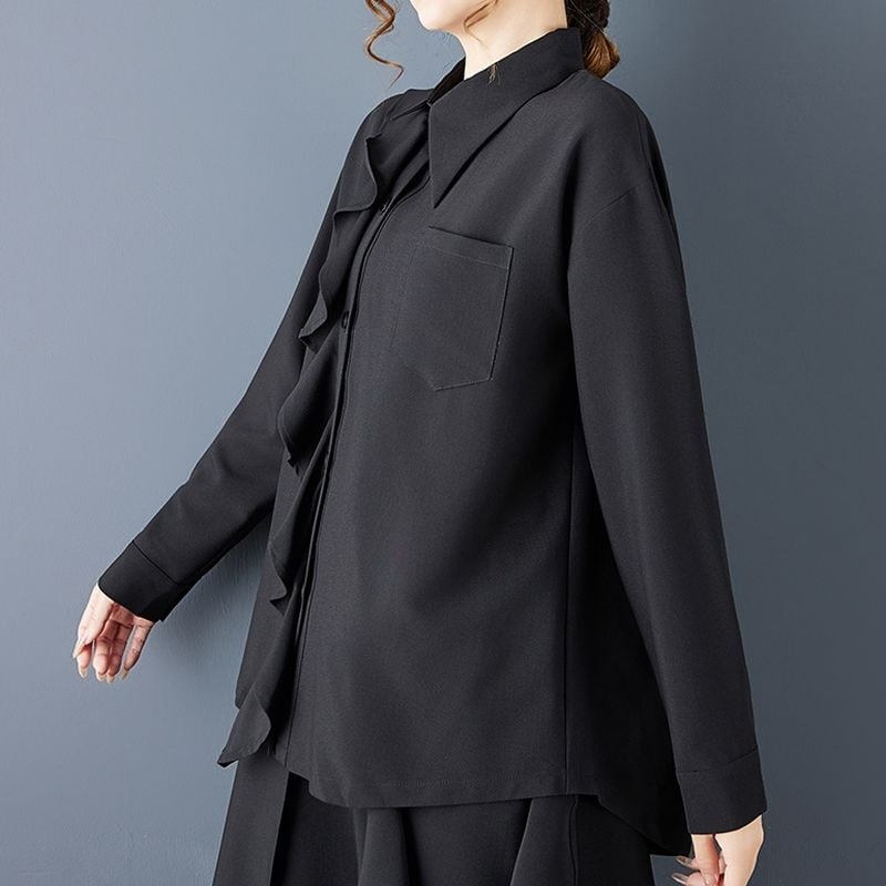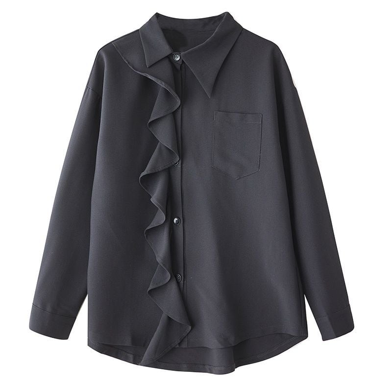 胸元に施した大きなフリルが印象的なデザインシャツ。