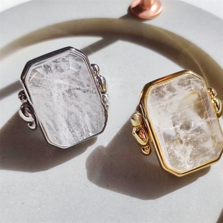 存在感のある長方形ストーンを主役にした、手元を印象づけるデザインリングです。