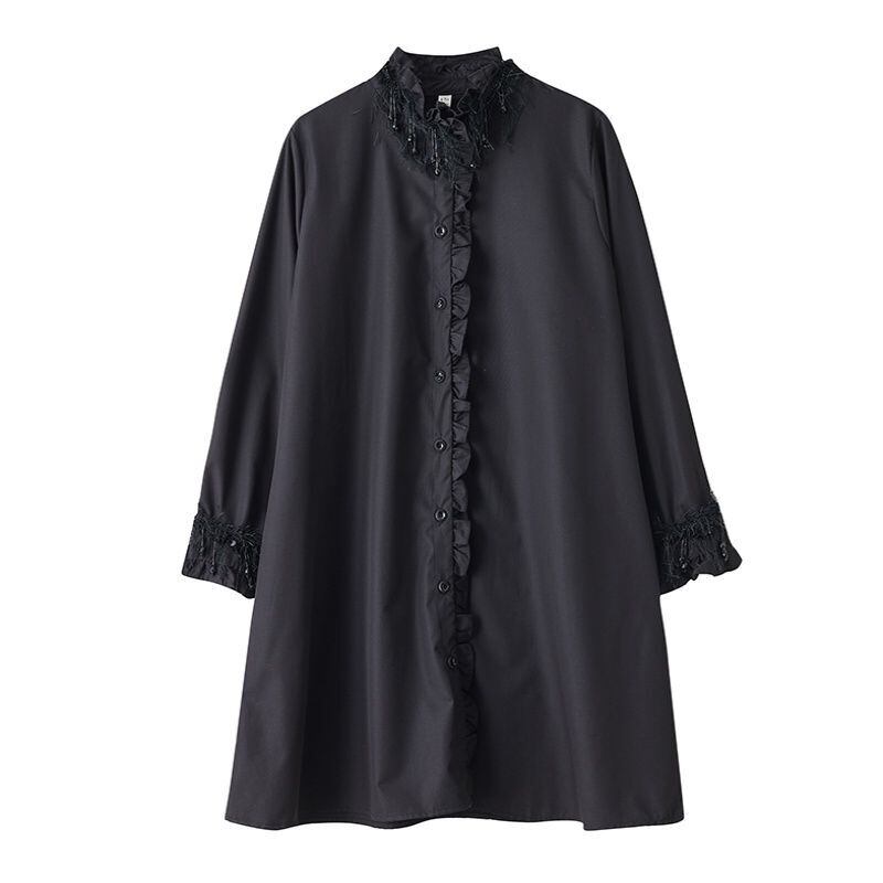 フロントのボタンラインに沿う控えめなフリルが、ブラックの中に柔らかなニュアンスをプラス。