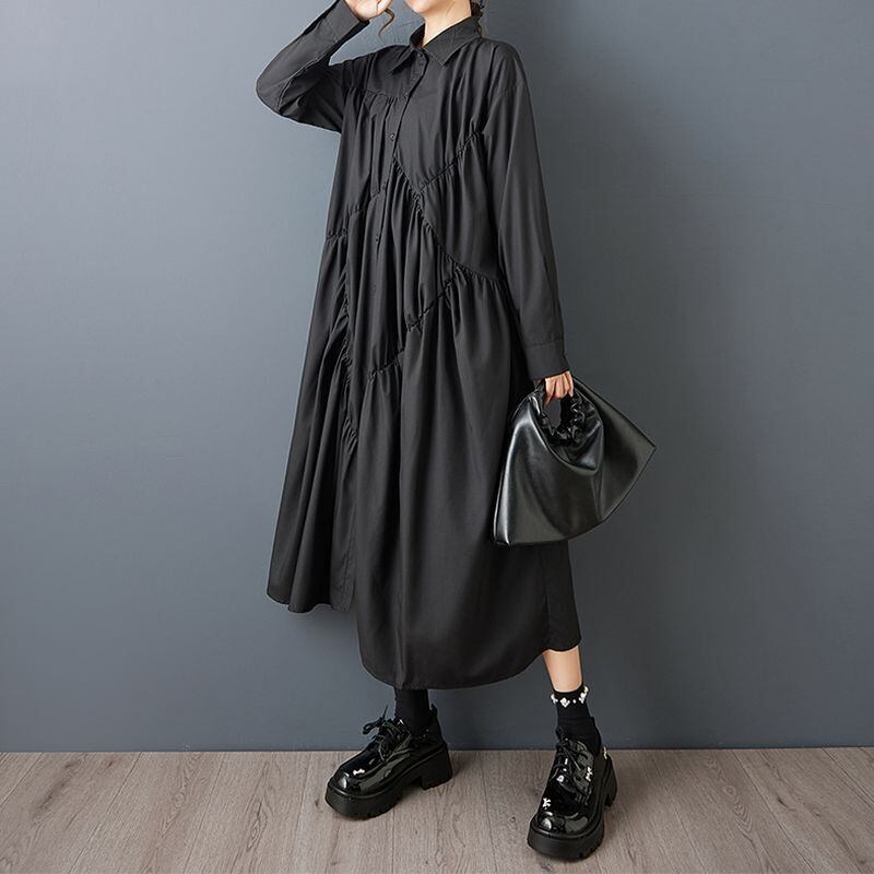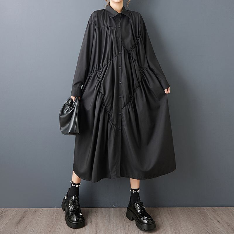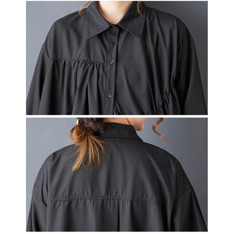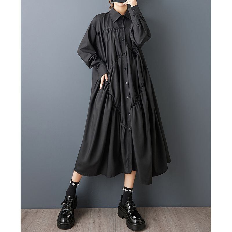 フロントのボタンと柔らかく広がる生地が自然な表情をつくり、ブラックでも軽やかな印象に。