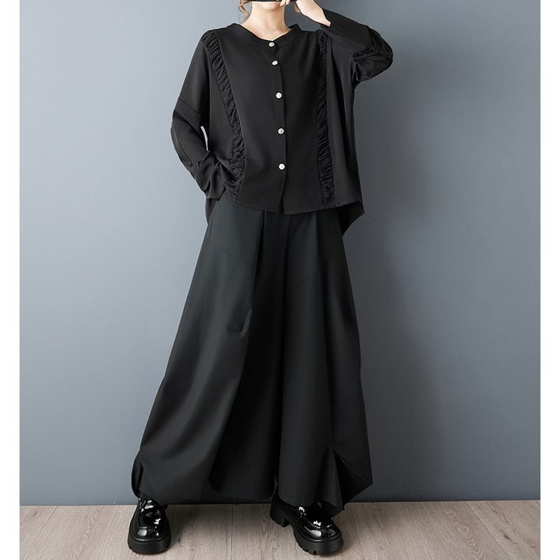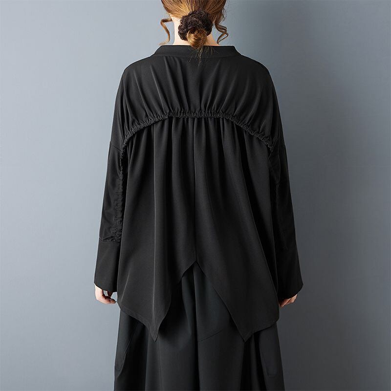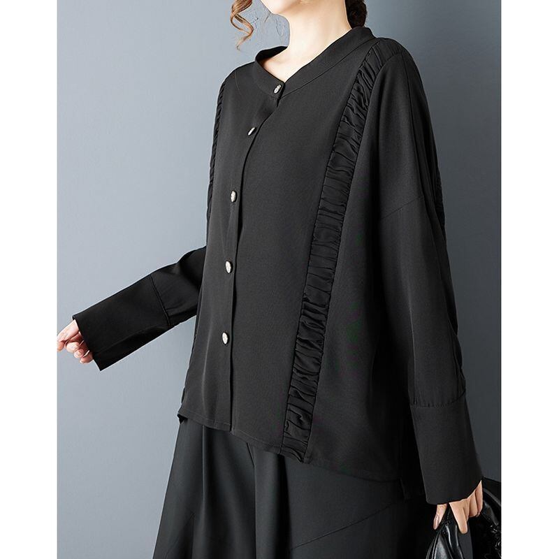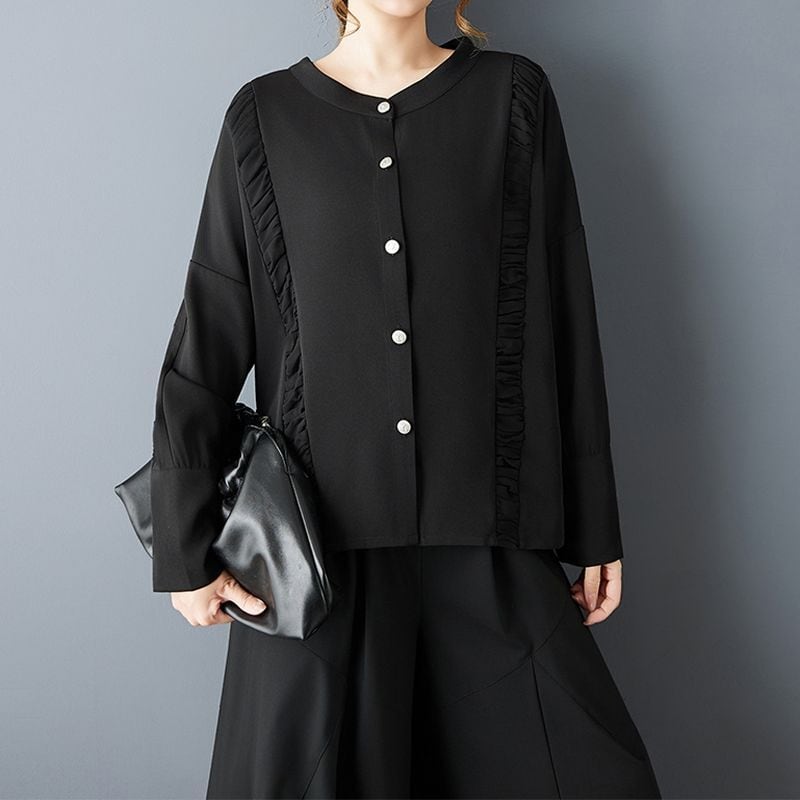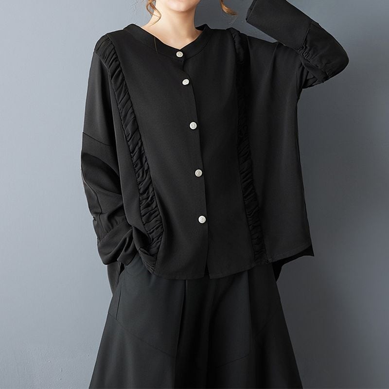 フロントに施したギャザーラインが縦の流れをつくり、シンプルながら印象的な表情を添えるブラウスです。