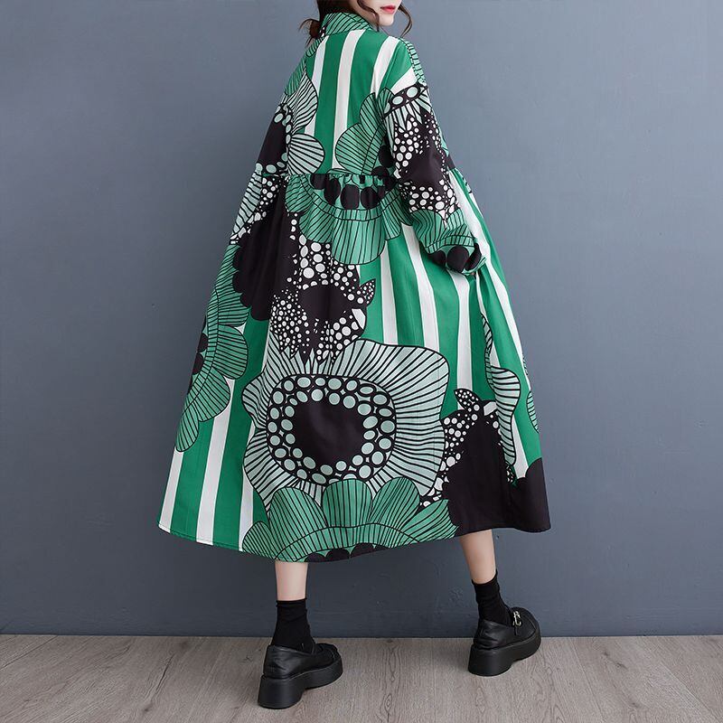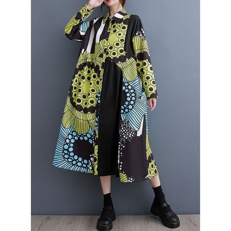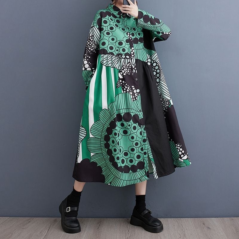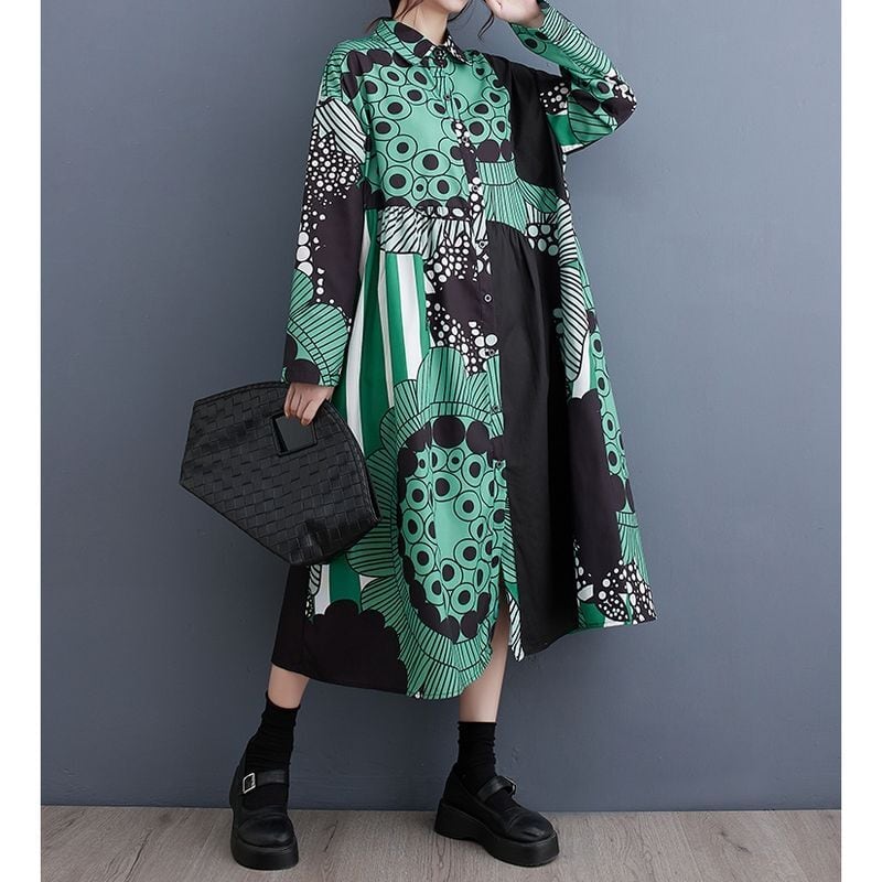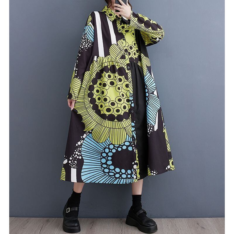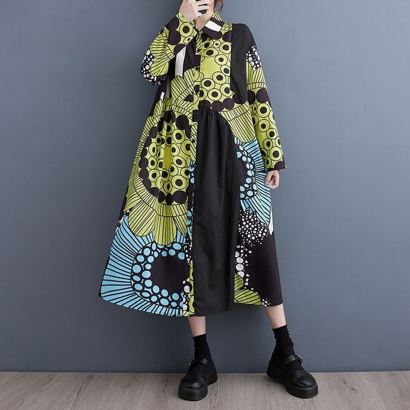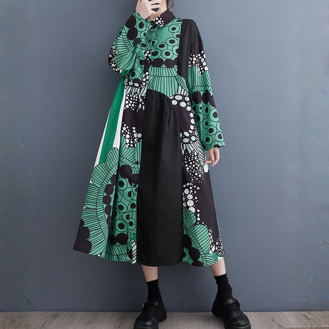 大胆なアート柄を切り替え、視線を惹きつける一枚に仕上げたワンピース。
