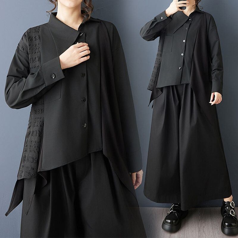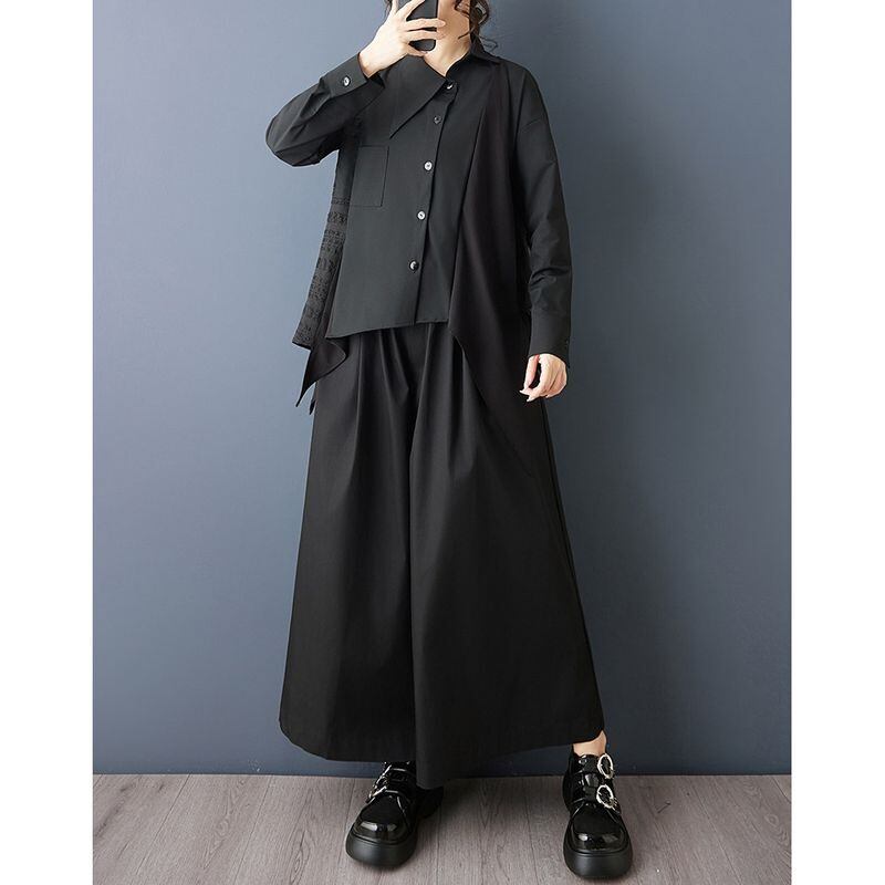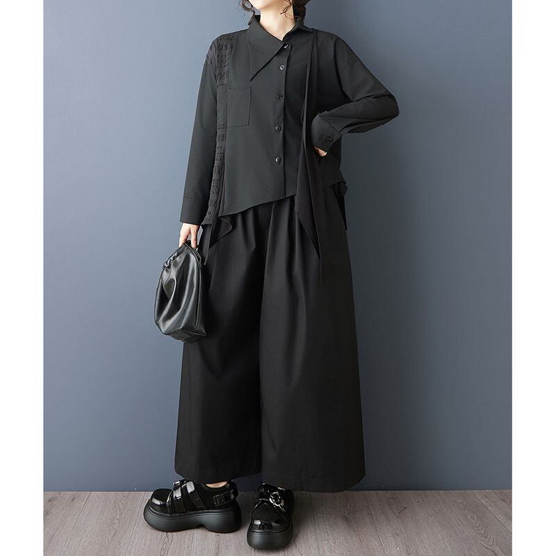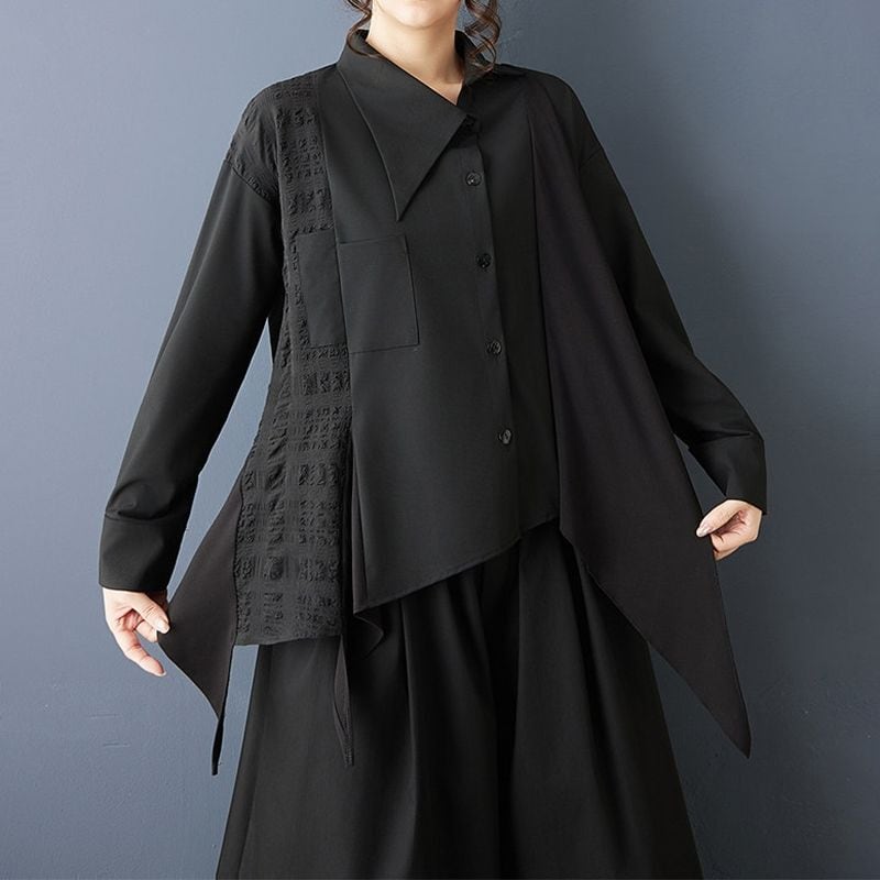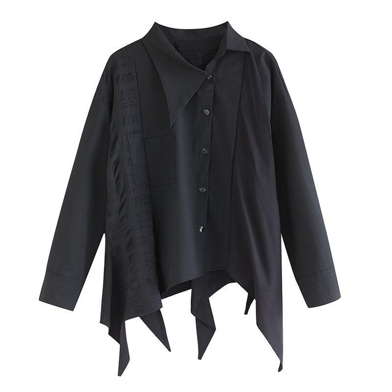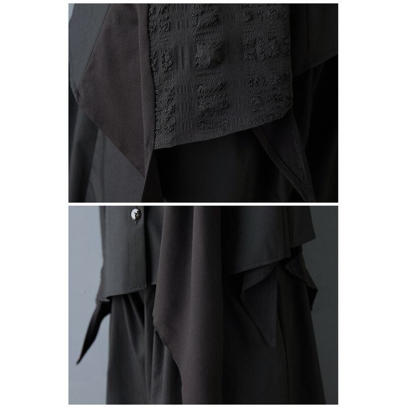 片側を大きく折り返したアシンメトリーな襟が、顔まわりに印象をつくります。