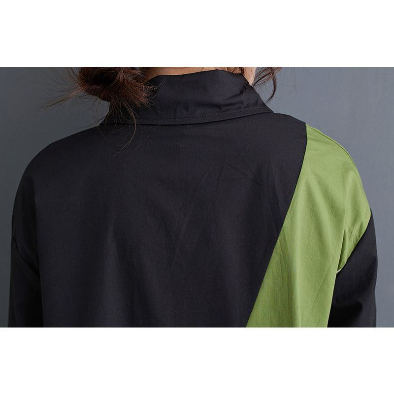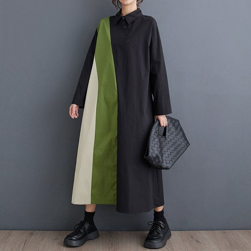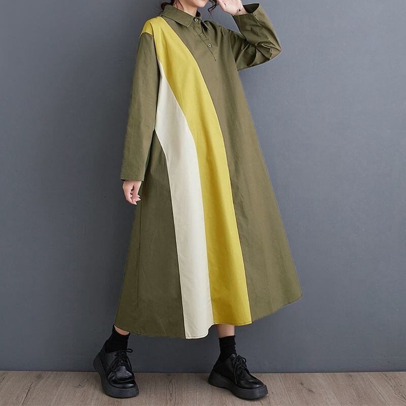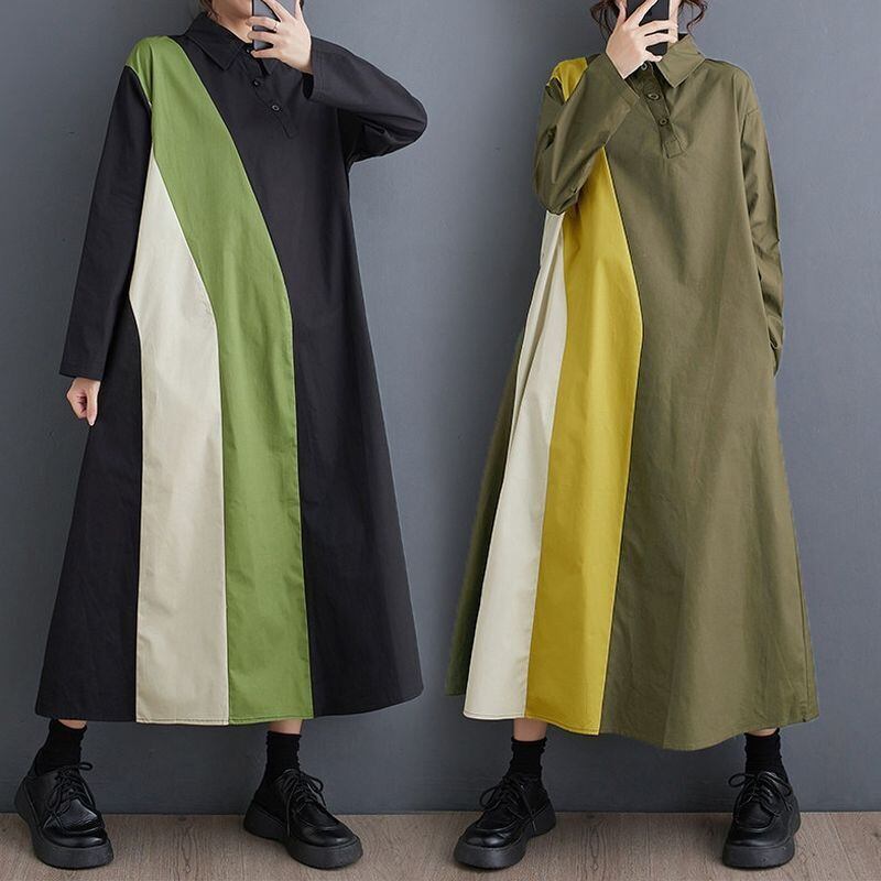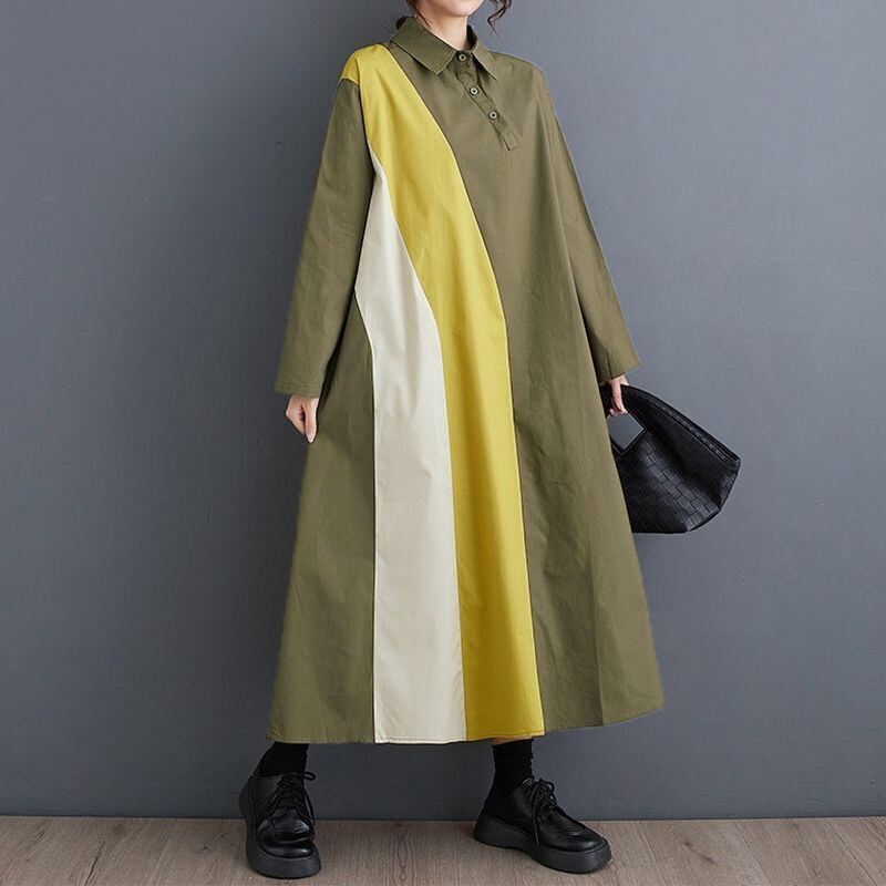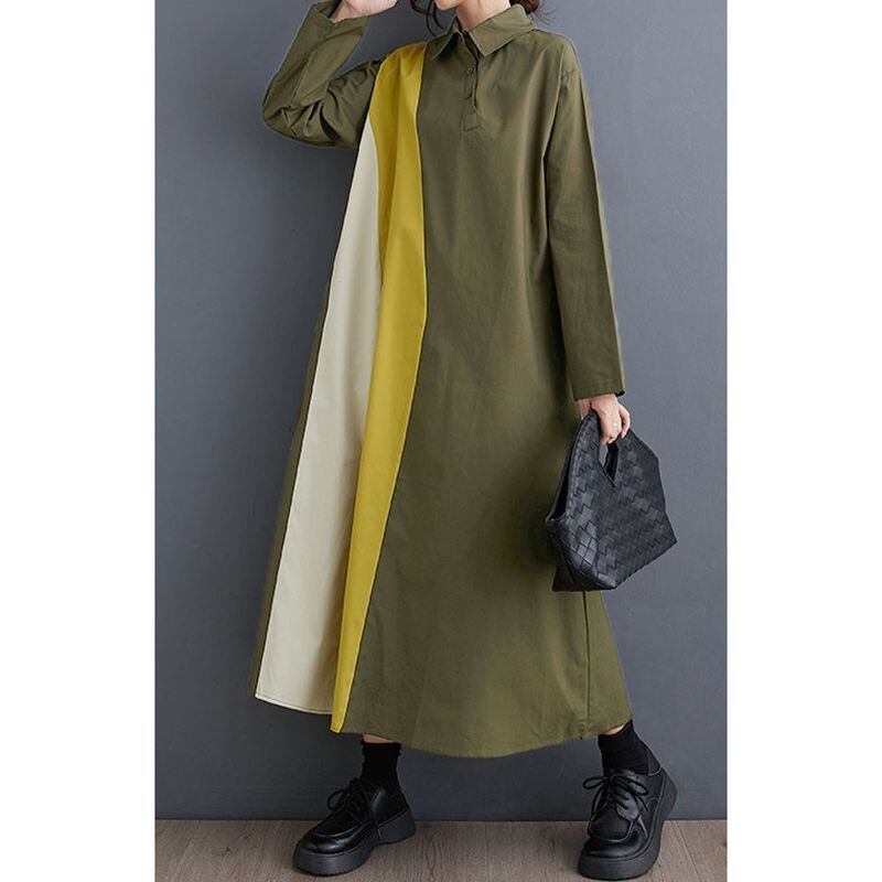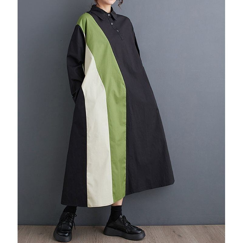 カラーブロックのデザインが目を引く、長袖シャツワンピース。