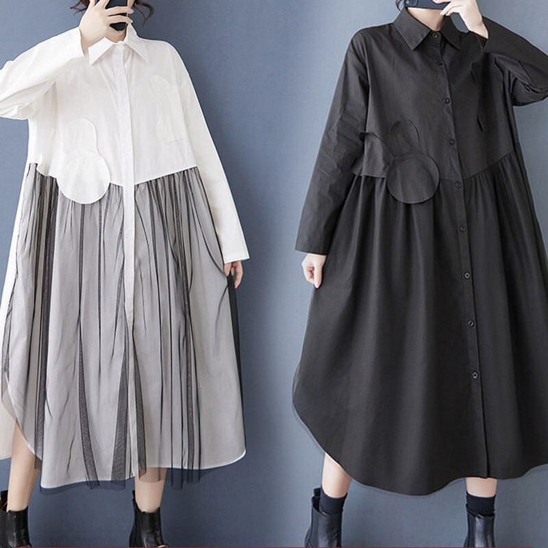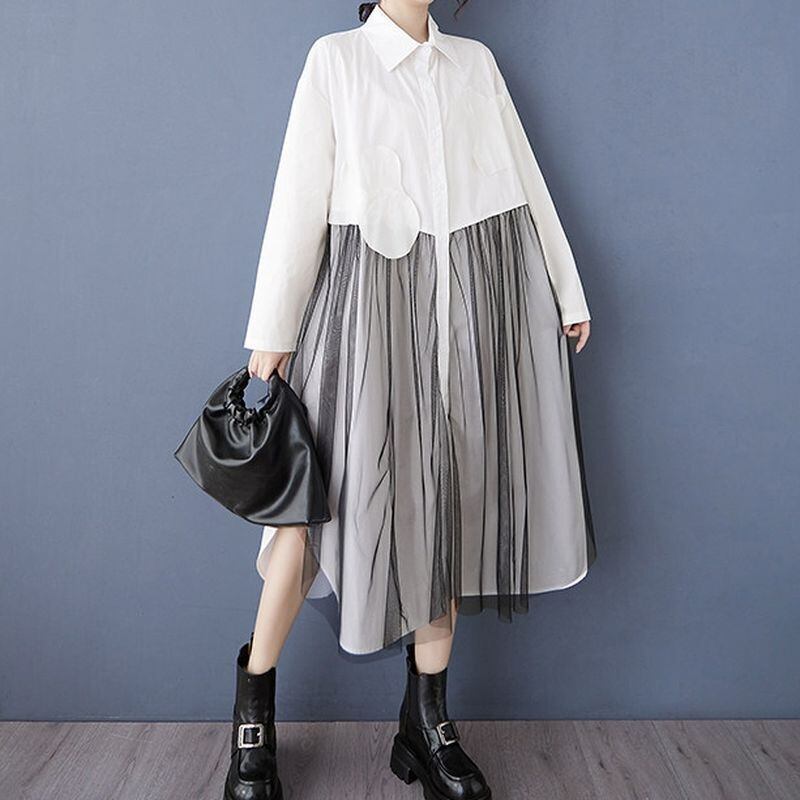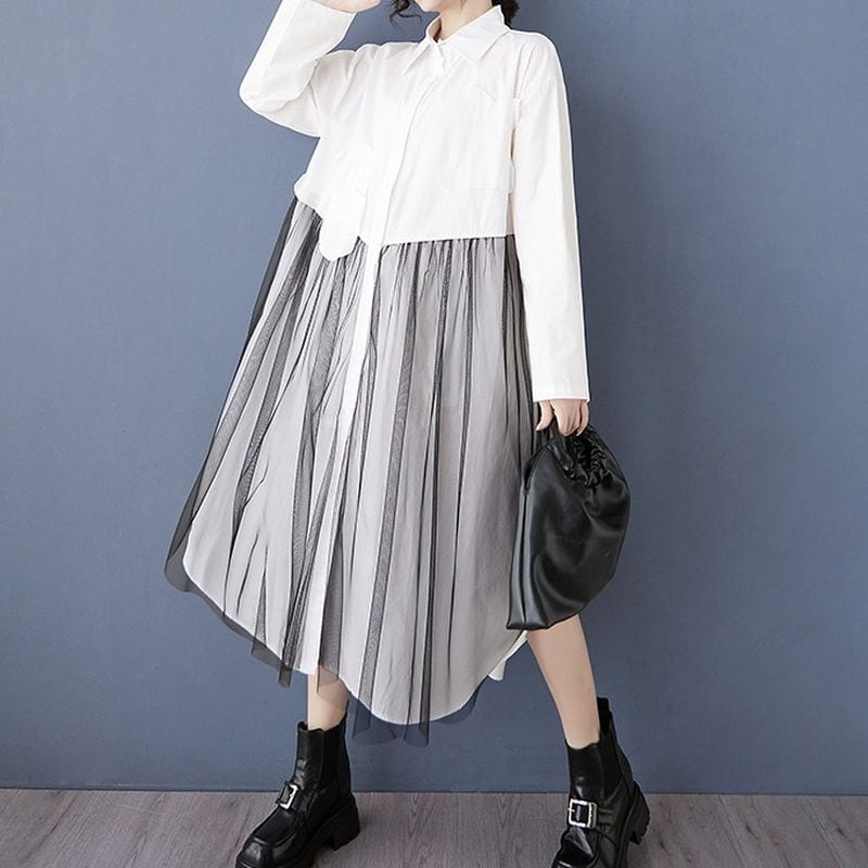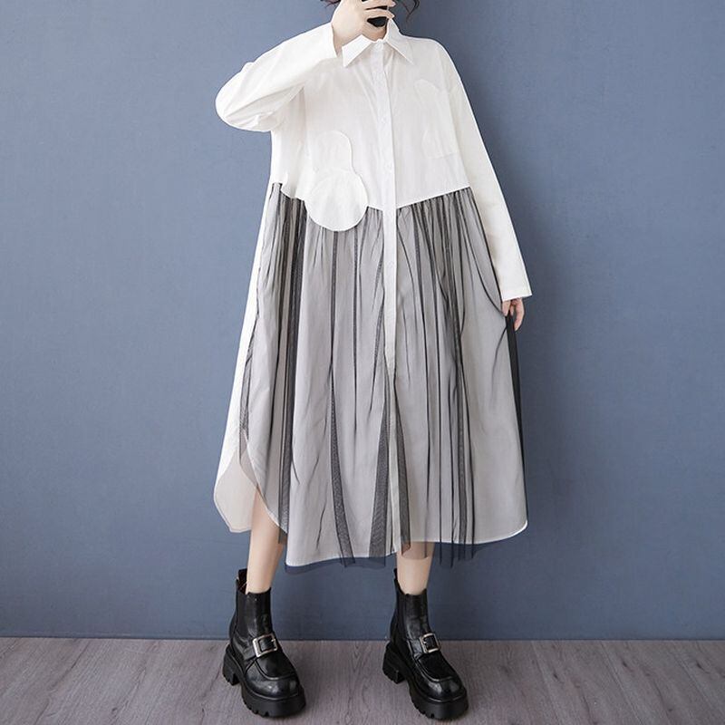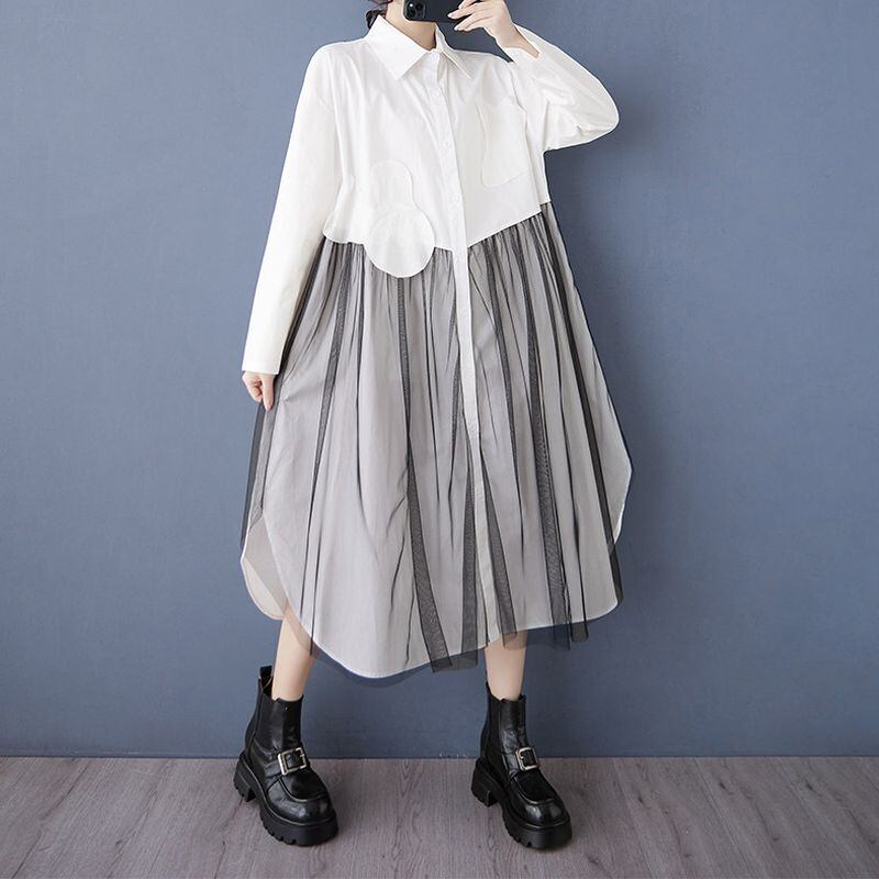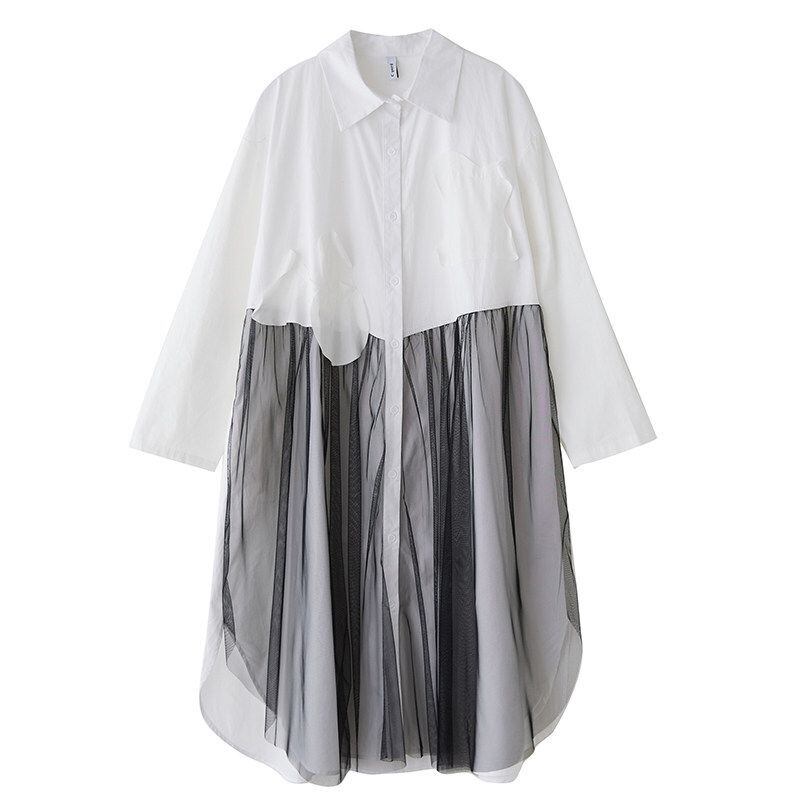 シャツデザインにチュールを重ねた、印象的なロングワンピース。