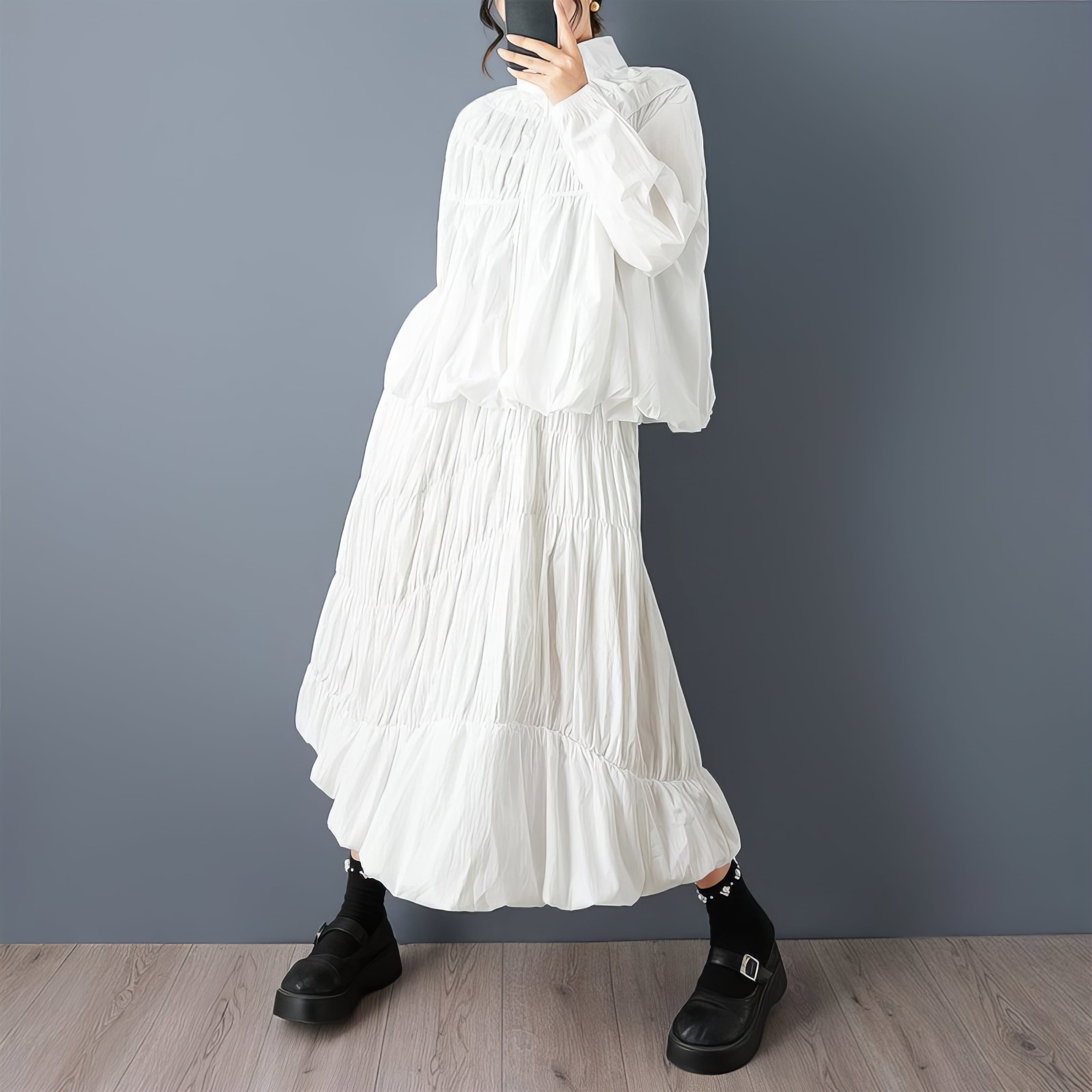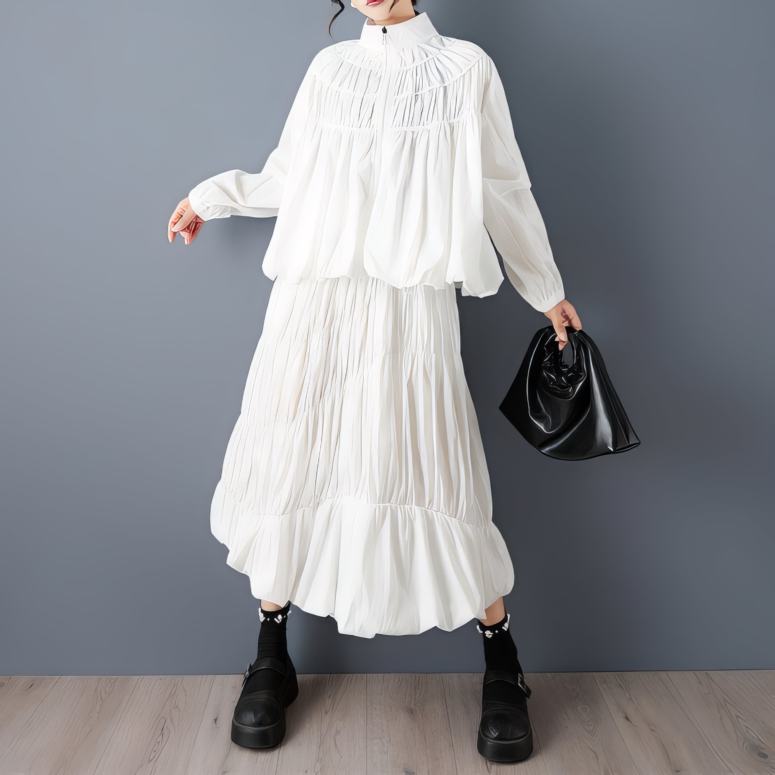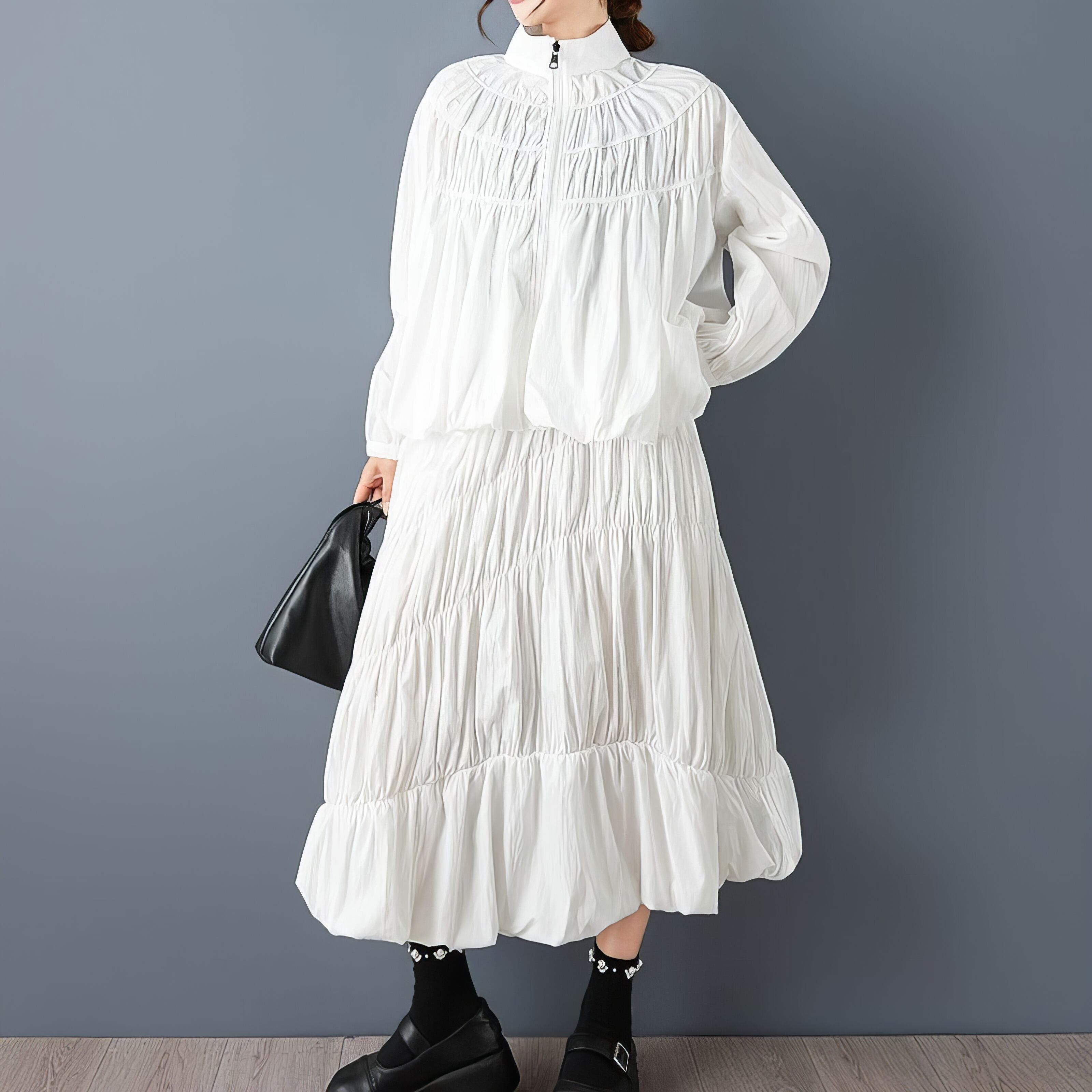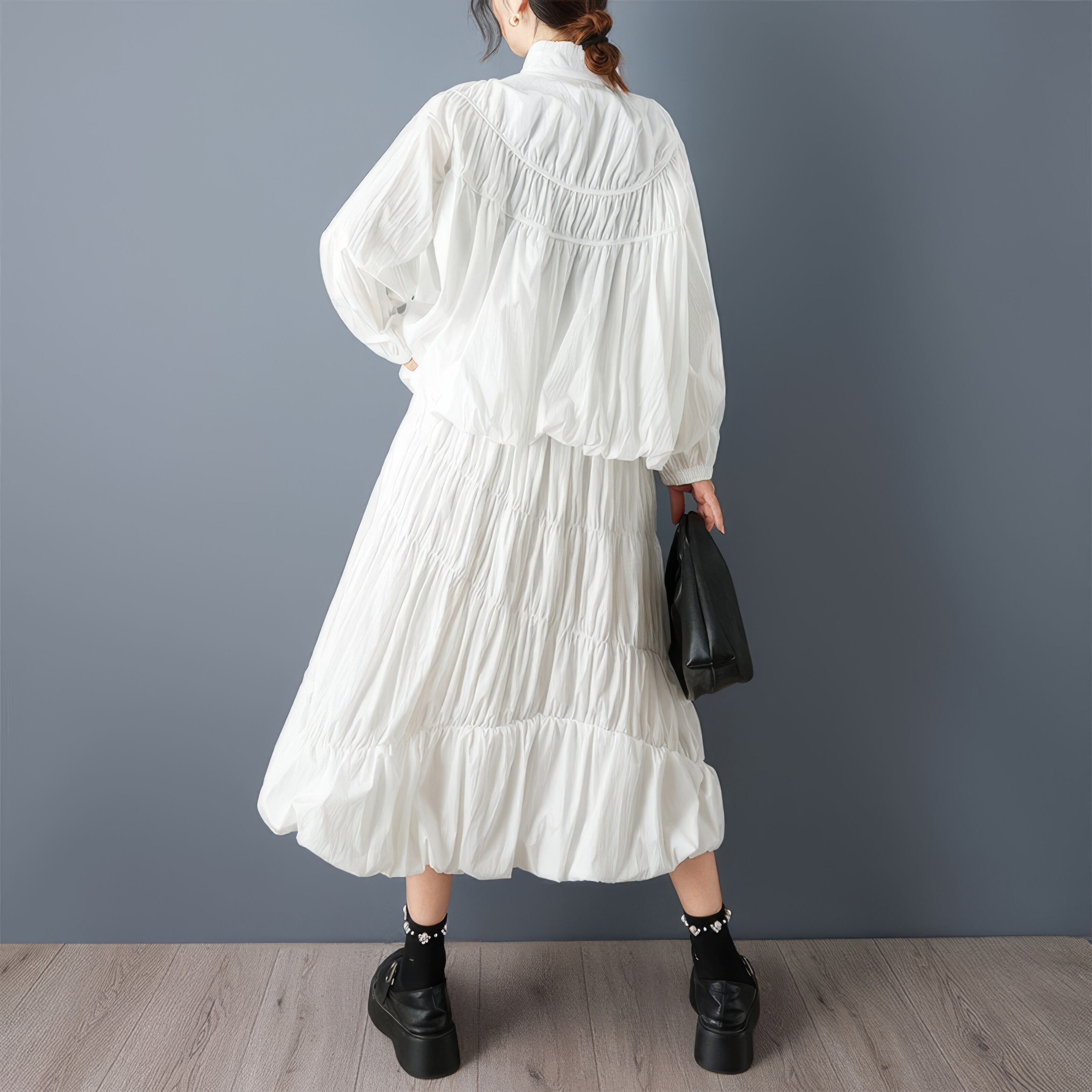 全体にたっぷりと入れたギャザーが、ふんわりとした立体感をつくるデザイン。 丸みのあるシルエットで、存在感がありながら重たく見えにくいバランスに。 単品でも使いやすく、上下で合わせるとバランスの整った着こなしが楽しめます。 ※attention※ ---------------------------------------- 商品は単品での販売となります。 セットでのご着用をご希望の場合は、それぞれをお求めください。 ---------------------------------------- 【サイズ】 ・トップス F 肩幅:56cm 胸囲:128cm 着丈:57cm 袖丈:52cm ・スカート F ウエスト:66-106cm ヒップ:172cm スカート丈:81cm ※モデル:F 着用 (身長:160cm 体重:51kg) ※手採寸のため1-3cmの誤差が生じることがございます。 【種類】 ・トップス ・スカート 【カラー】 ・グレー ・ブラック ・ホワイト 【素材】 ・ポリエステル ・その他 ■大人気 *Hot item* をご紹介 https://shop.morebelle.com/categories/6319500 ■MoreBelleでおしゃれをお楽しみください。 下記URLよりコレクションをチェック https://shop.morebelle.com 【お届けについて】 こちらの商品は海外店舗より直接発送となる為、 ご注文から 1~4週間(平均2週間)前後で発送いたします。 ■注意事項 ・タイミングによっては 商品在庫切れにより 注文キャンセルとさせていただく恐れもございますので、予めご了承くださいませ。 ・こちらは輸入品となります。日本製とは検品基準が異なる為、 新品未使用品でもごくわずかな汚れや ほつれがある場合もございます。 ・仕入れ工場を変えることがあるため、記載サイズと若干異なる場合がございます。 ・商品の色味は、お使いのモニター環境によって実物と若干異なる場合がございます。 ・イメージ違いやサイズ交換等、お客さまご都合による交換、返品は対応出来かねます。 ■Instagramで新しいファッションをシェア https://www.instagram.com/morebelle.official ------------------------ ご購入前に「ご利用ガイド」をお読みください →https://shop.morebelle.com/about ------------------------ ※メールアドレスはキャリアメール以外をご入力いただきますよう、ご協力をお願いします。