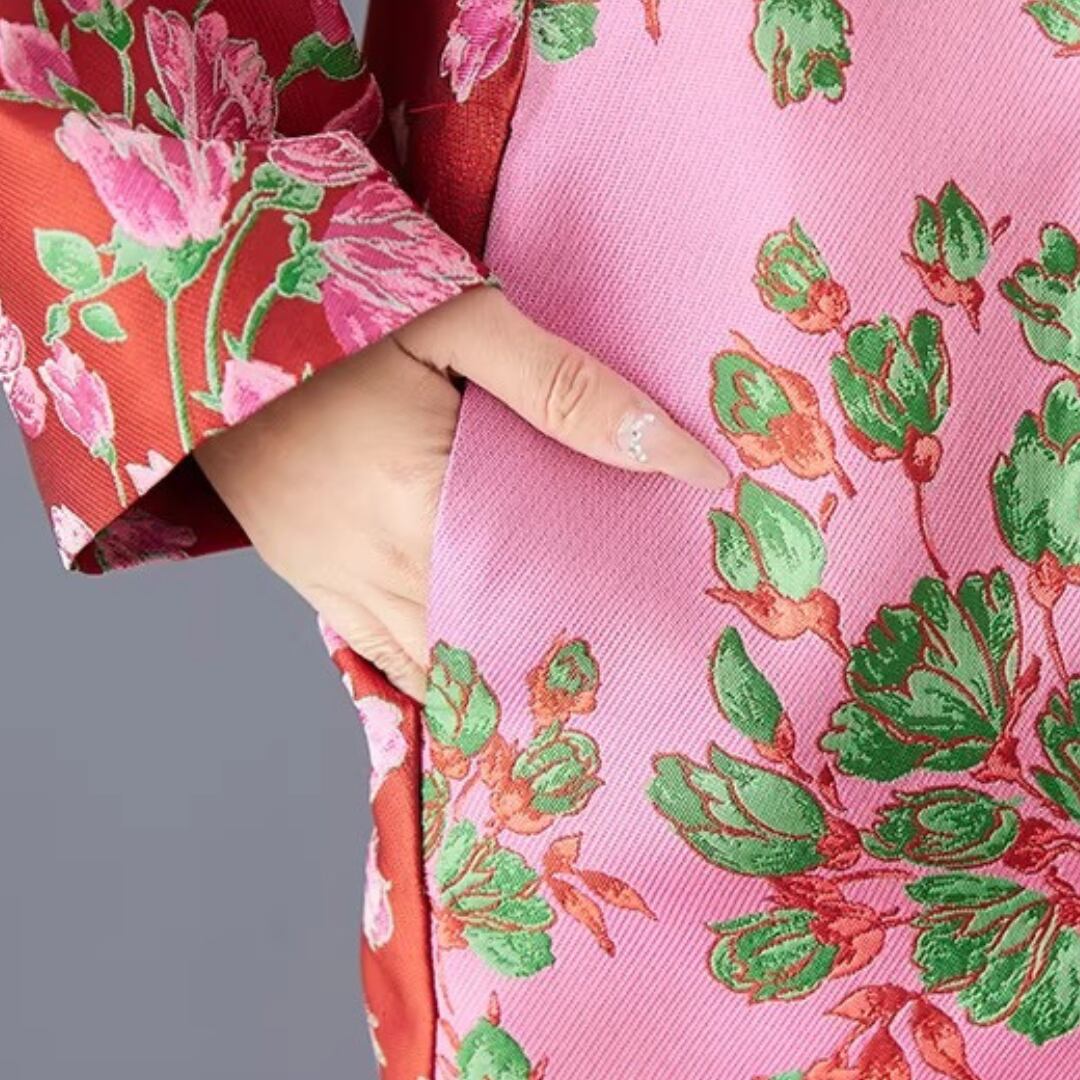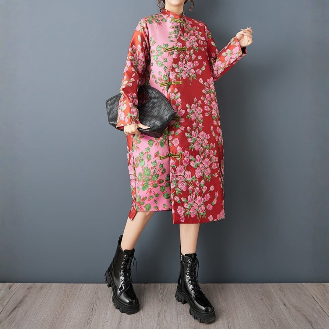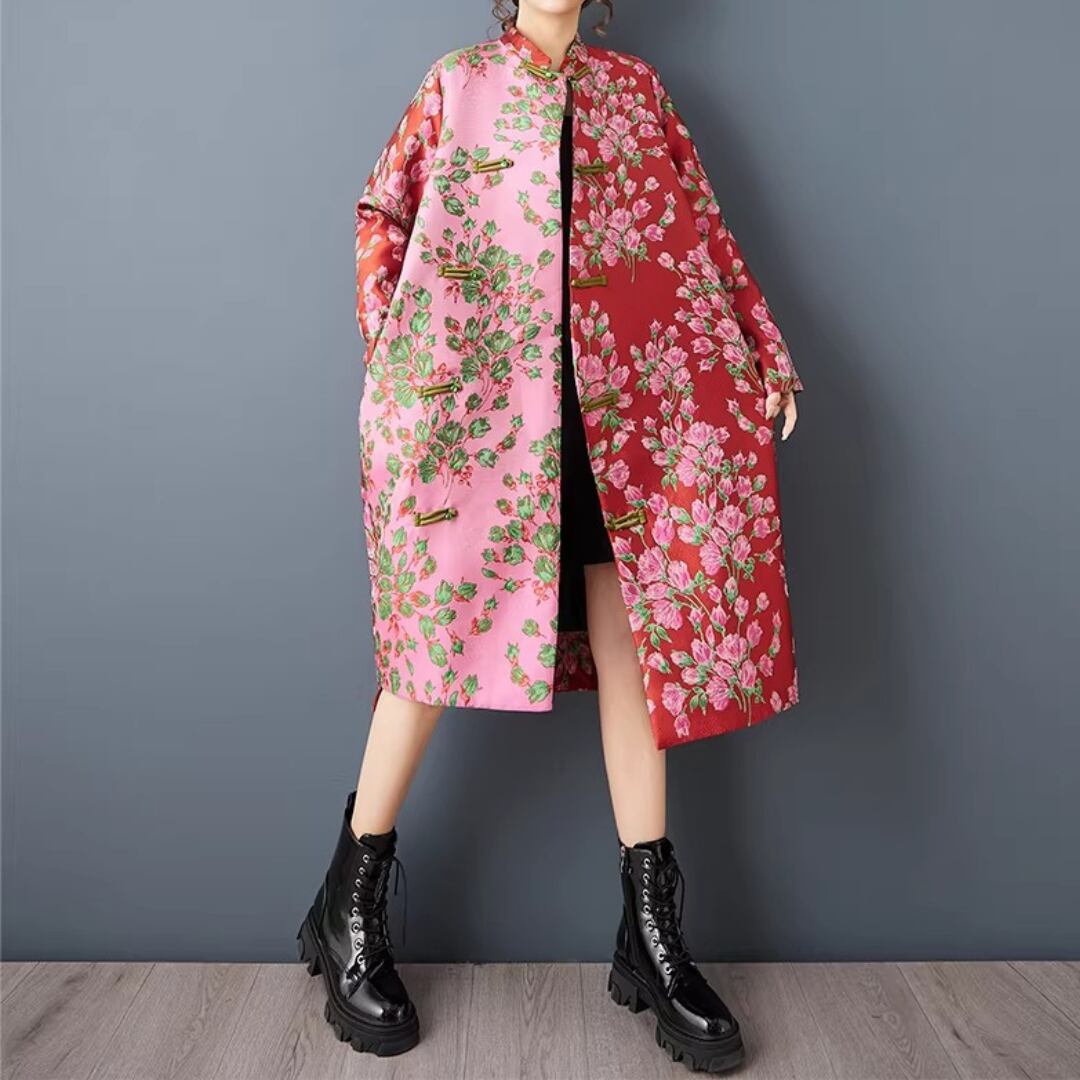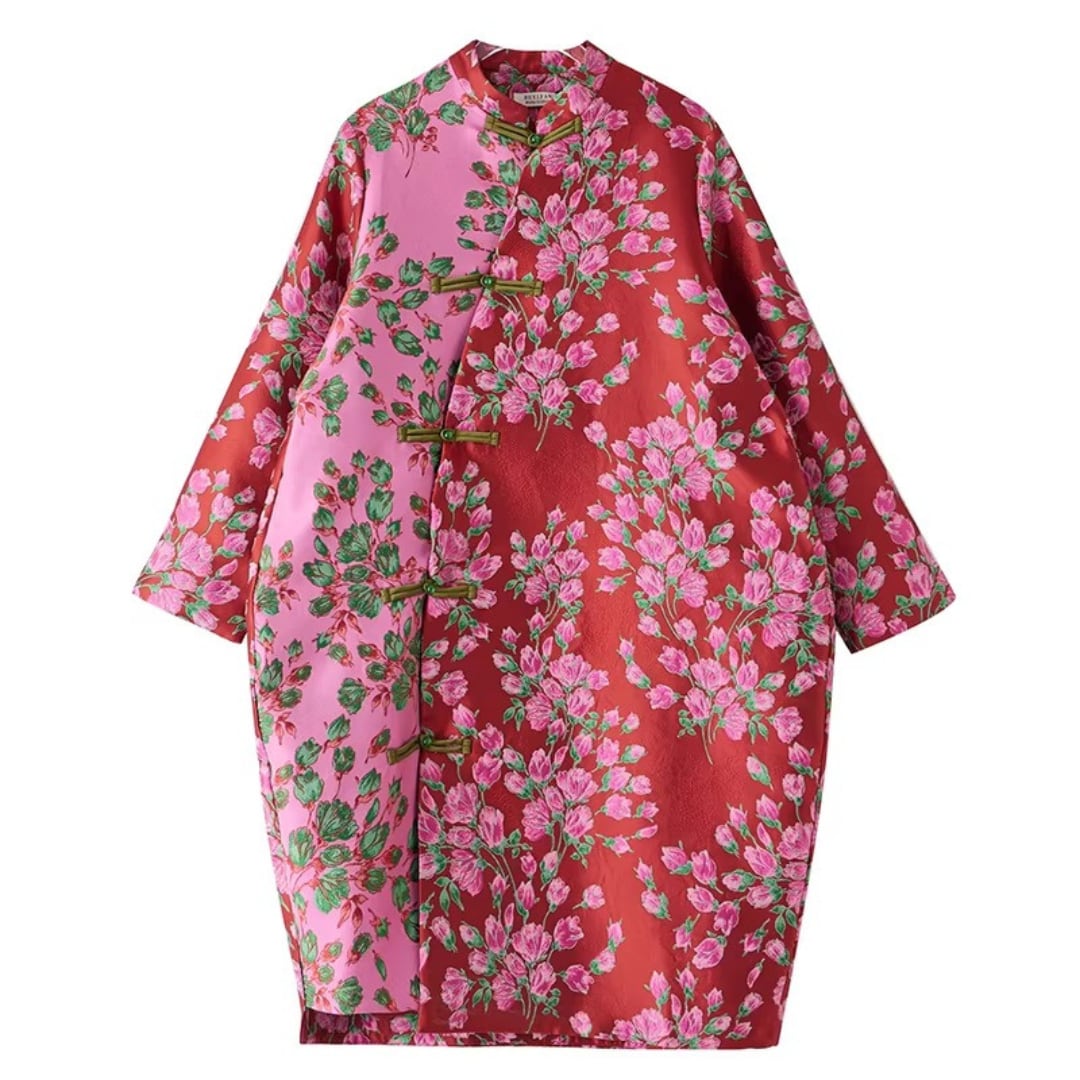 印象的な花柄と配色切替が目を引くチャイナ風コート。