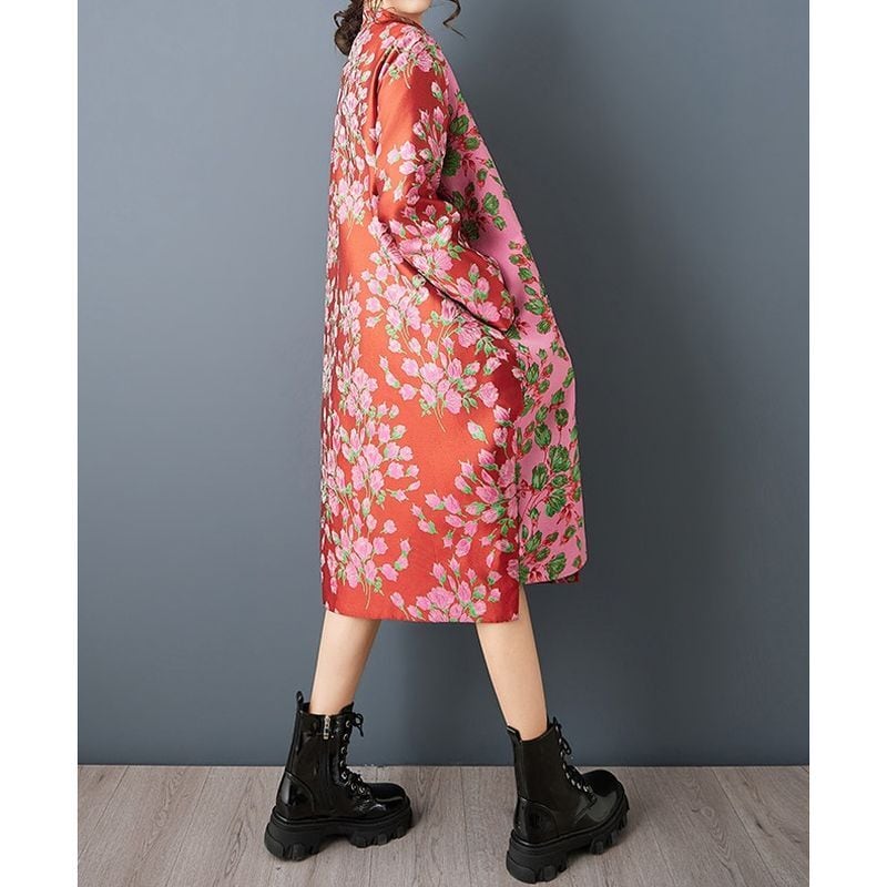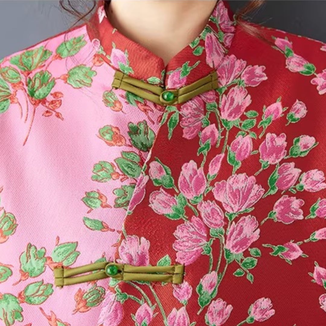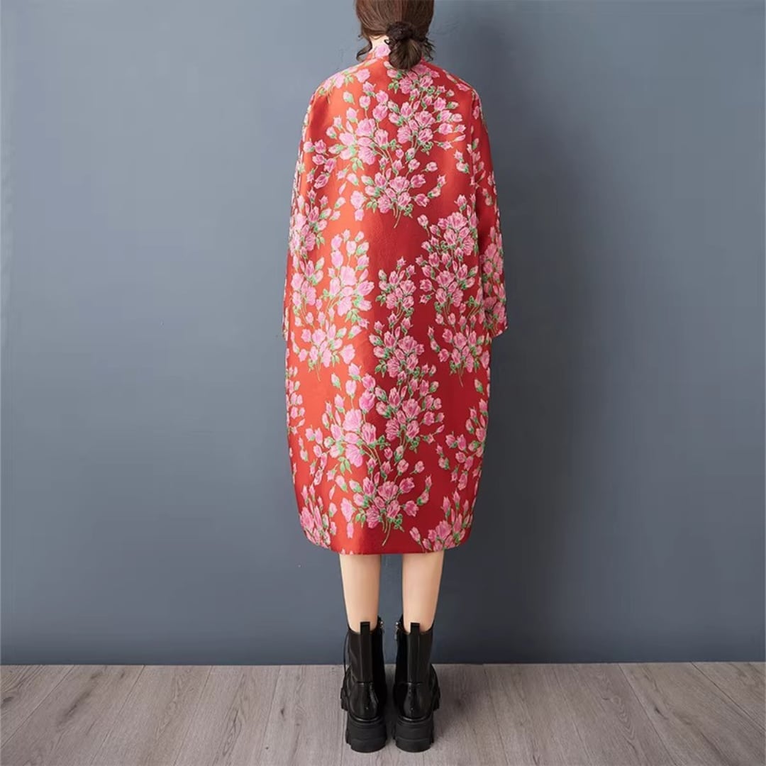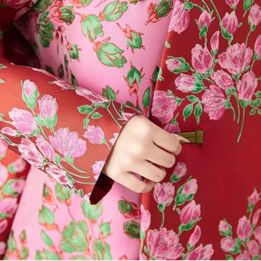 印象的な花柄と配色切替が目を引くチャイナ風コート。