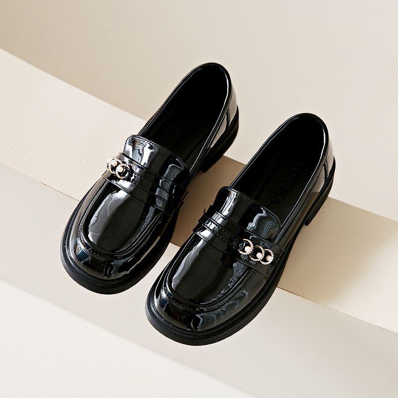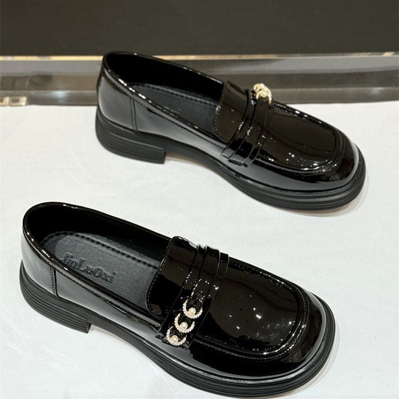 クラシックなローファーデザインに、パールとチェーンの装飾をプラス。
