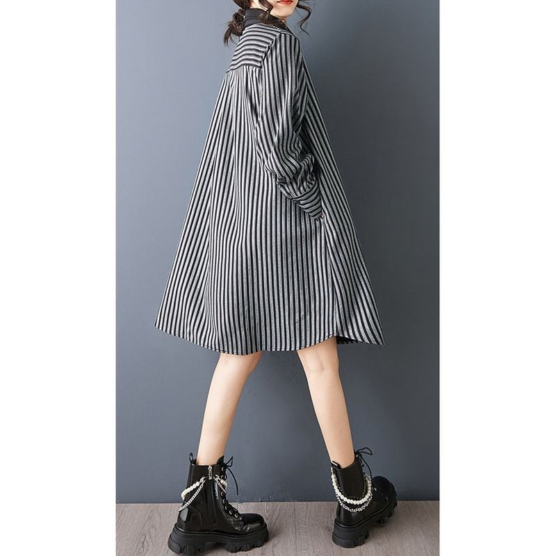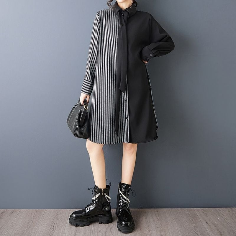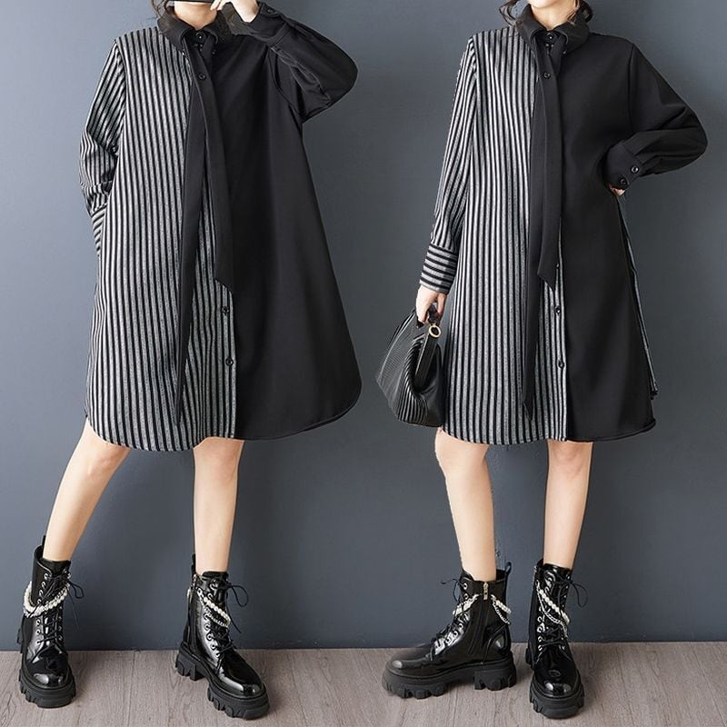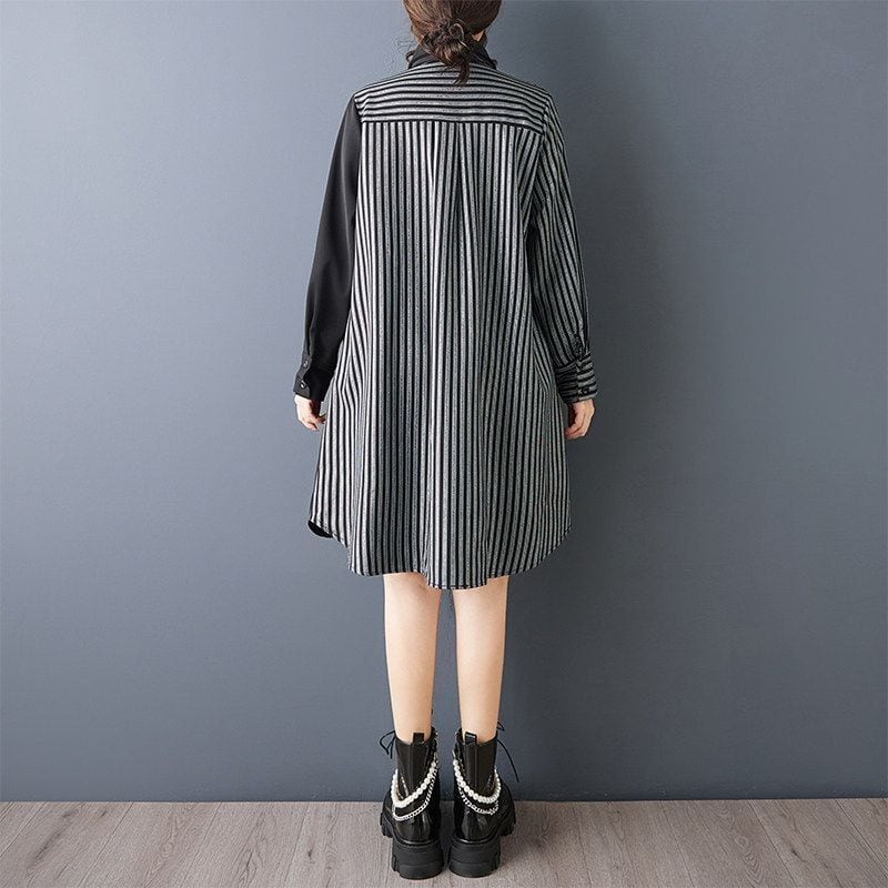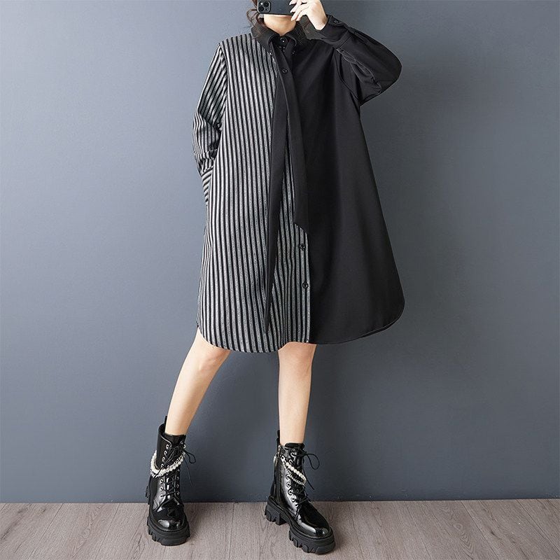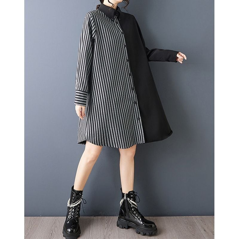 ストライプと無地を組み合わせた切替デザインが印象的なシャツワンピース。