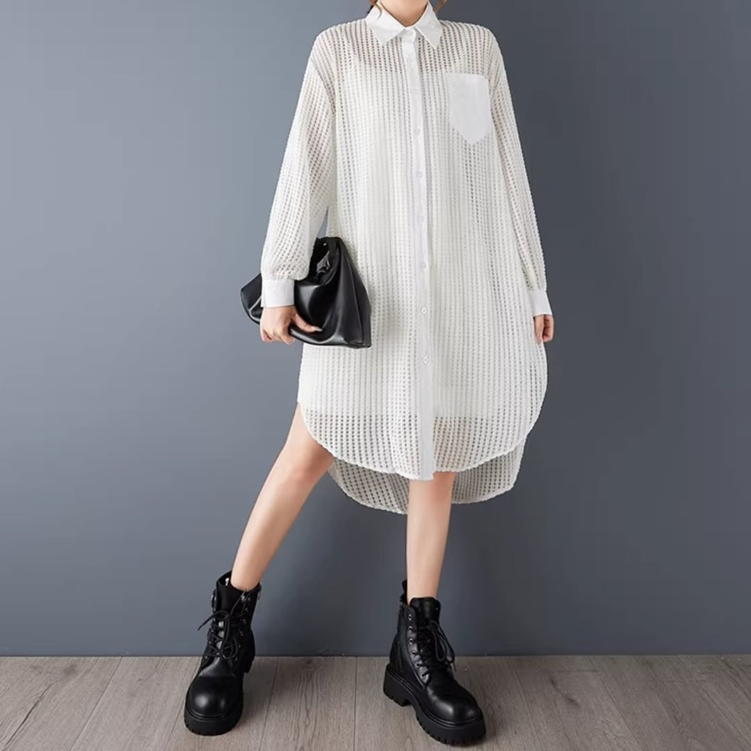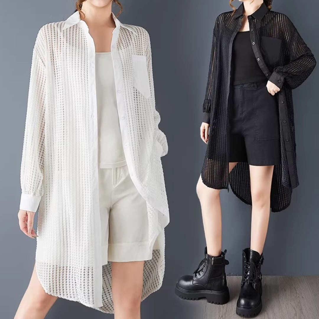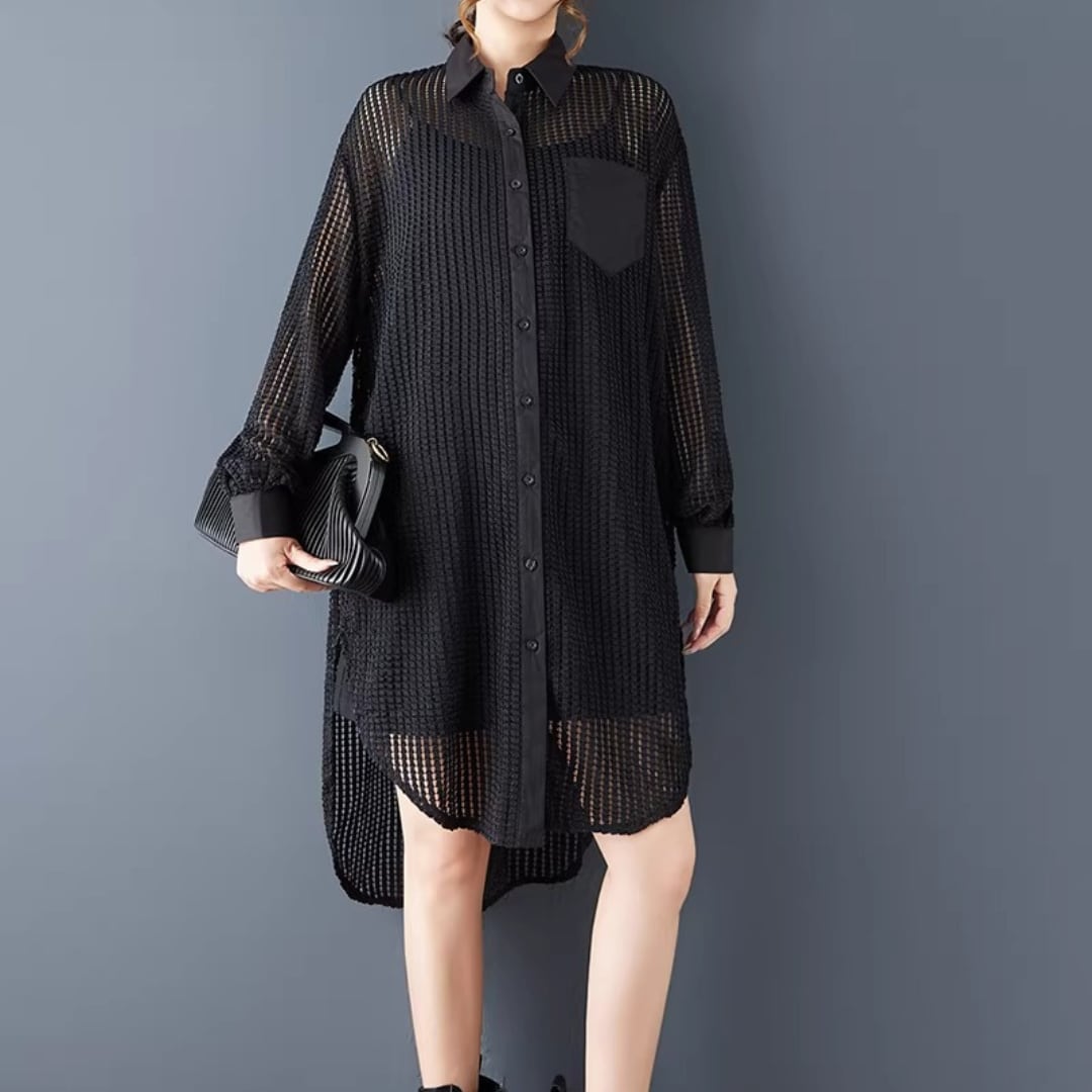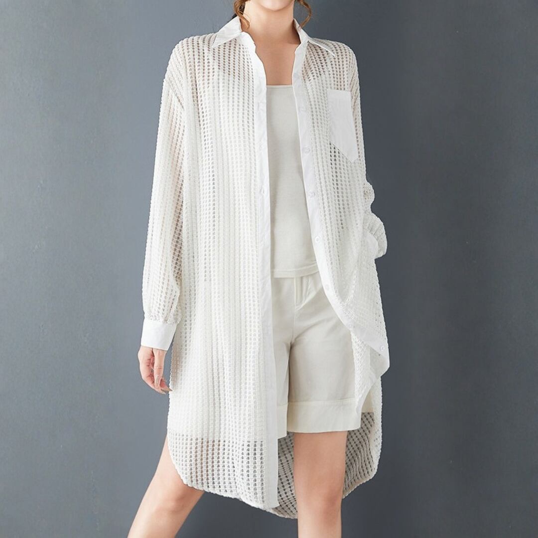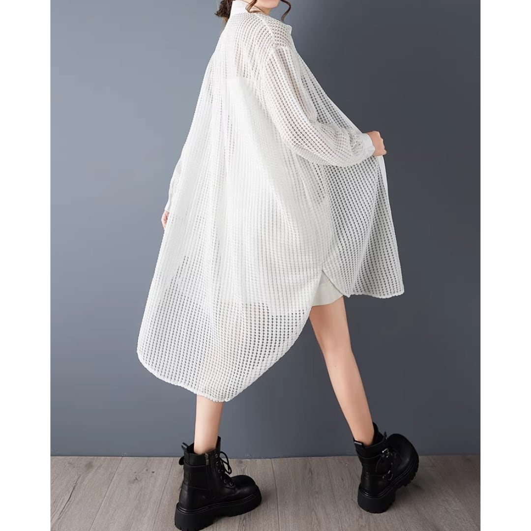 軽やかなメッシュ素材が、抜け感のあるスタイルを演出するロングシャツ。
