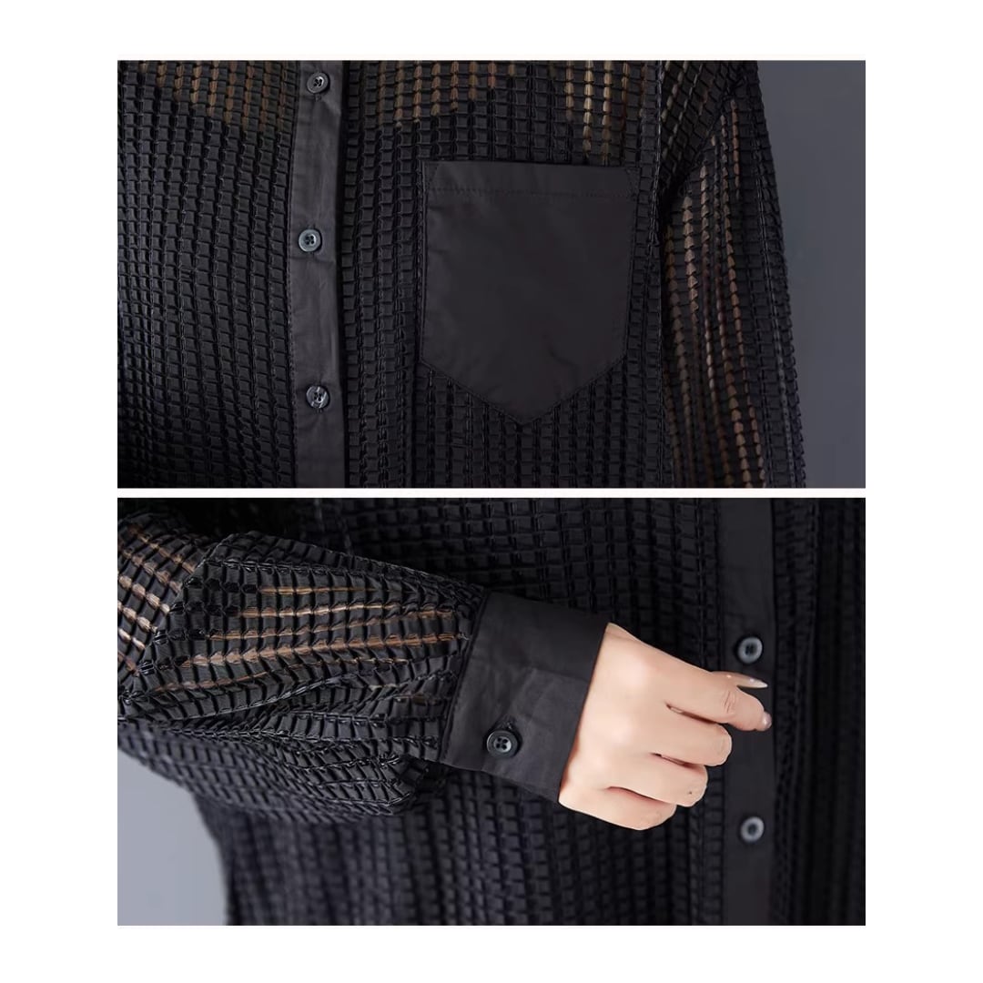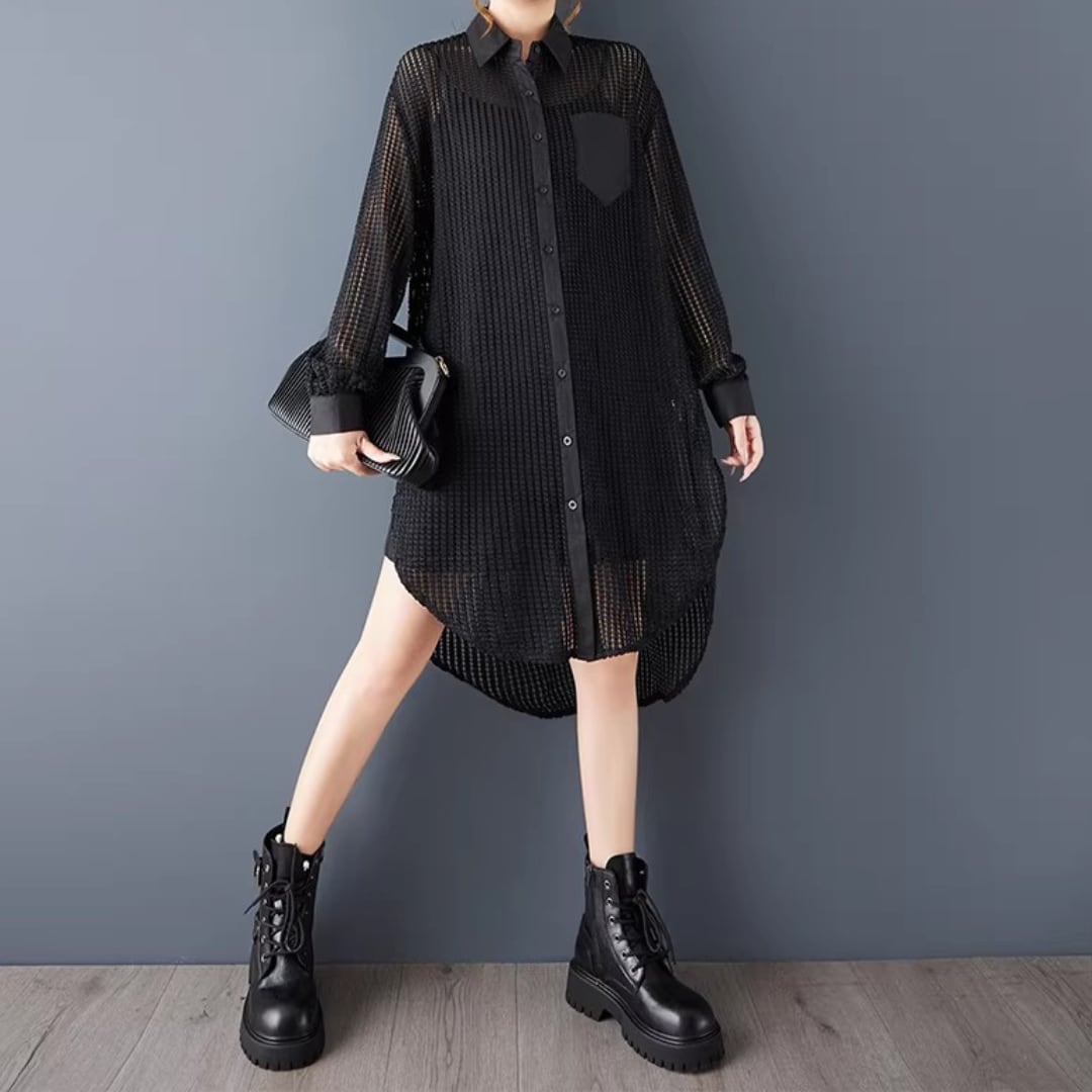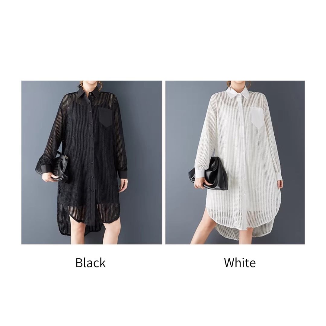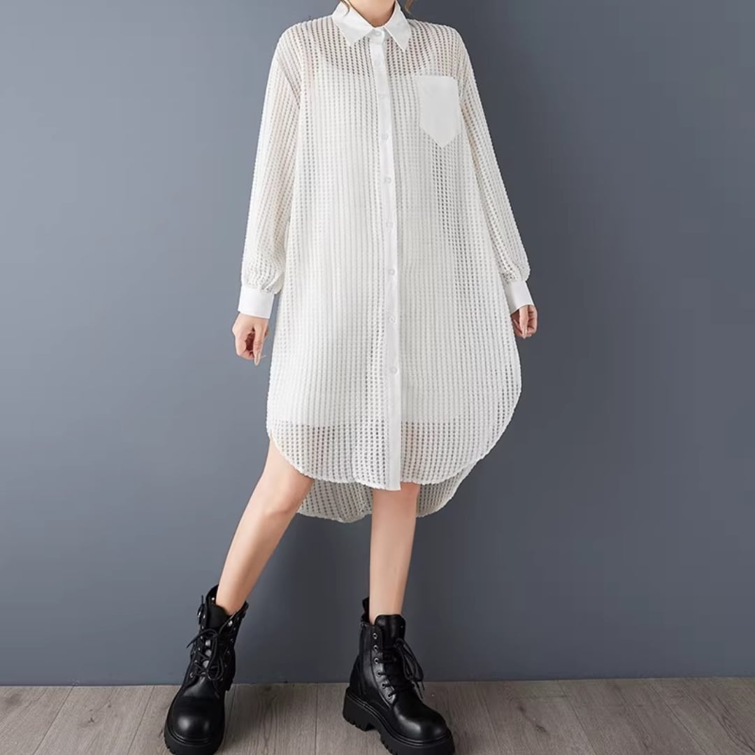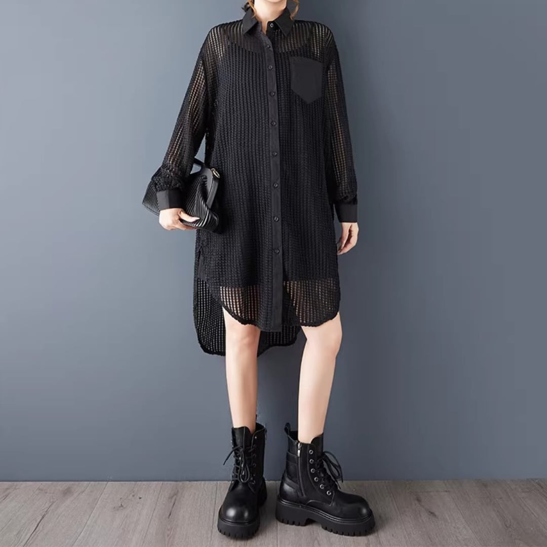 軽やかなメッシュ素材が、抜け感のあるスタイルを演出するロングシャツ。