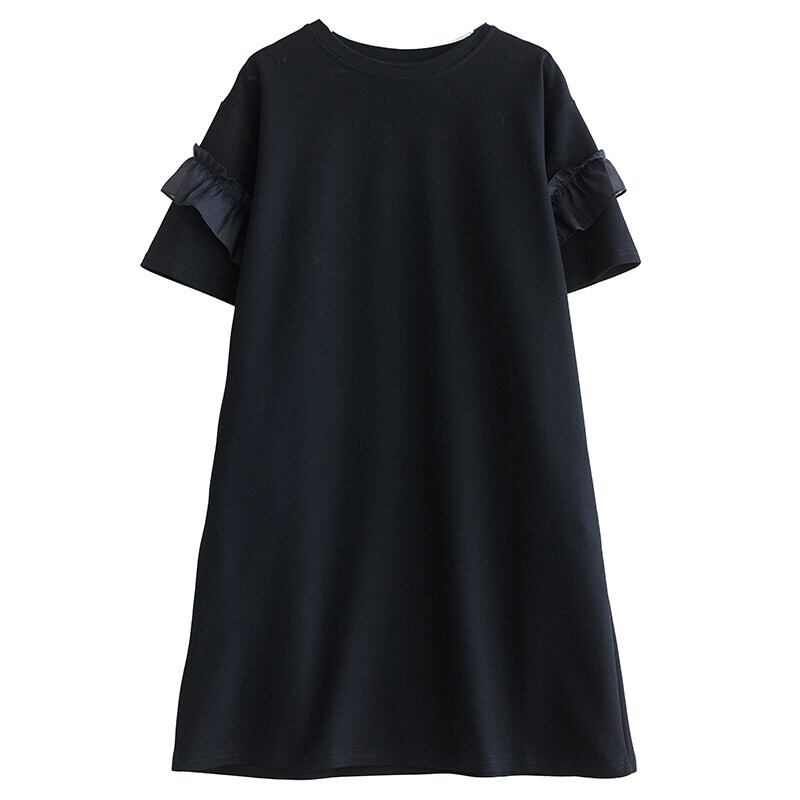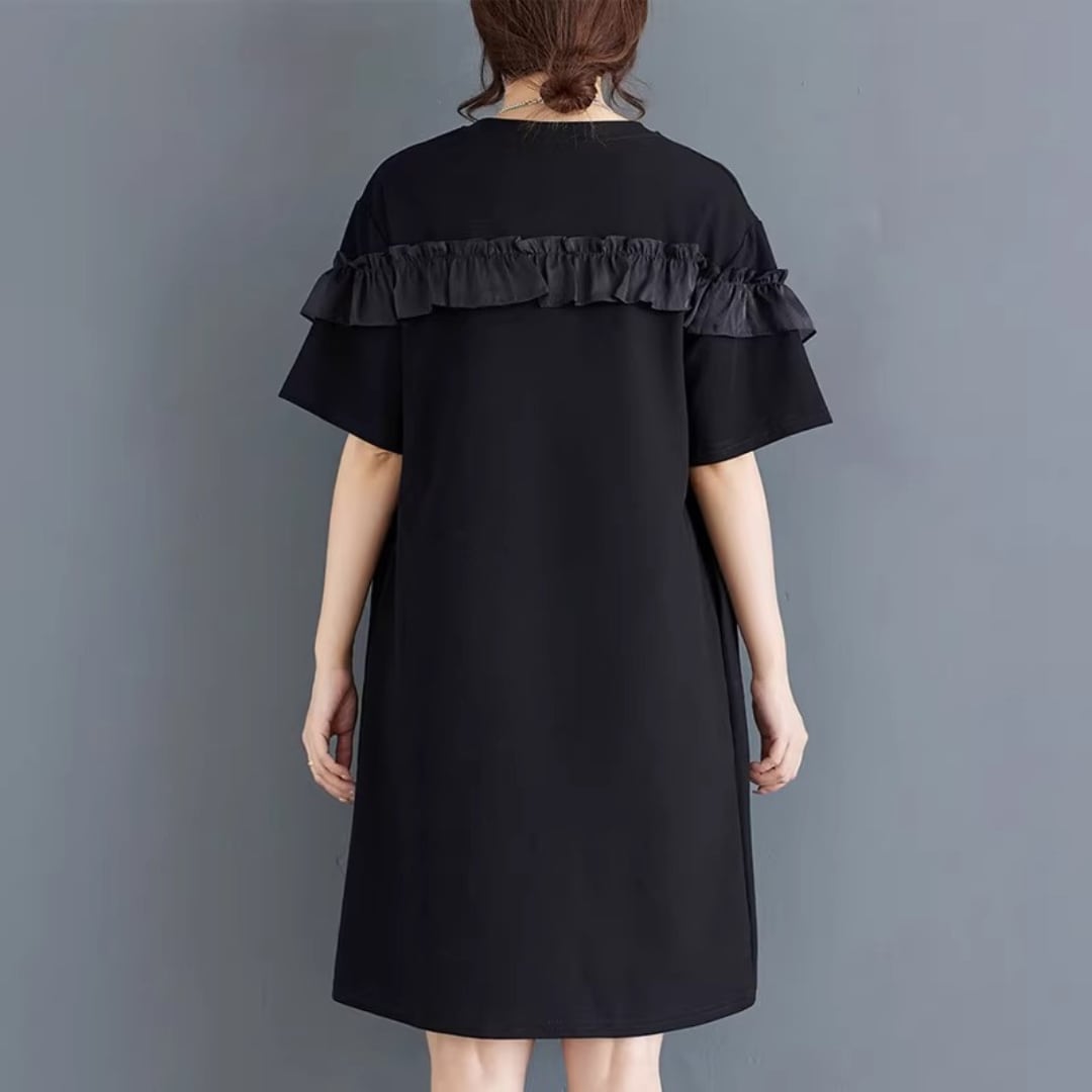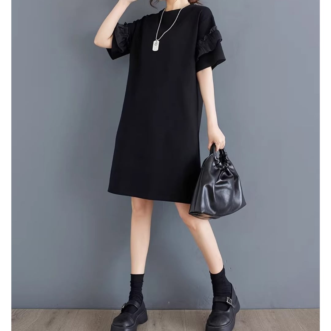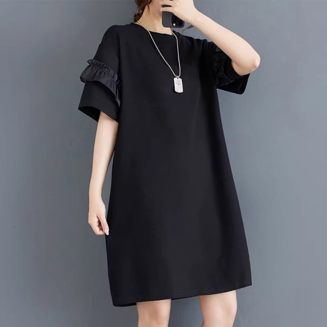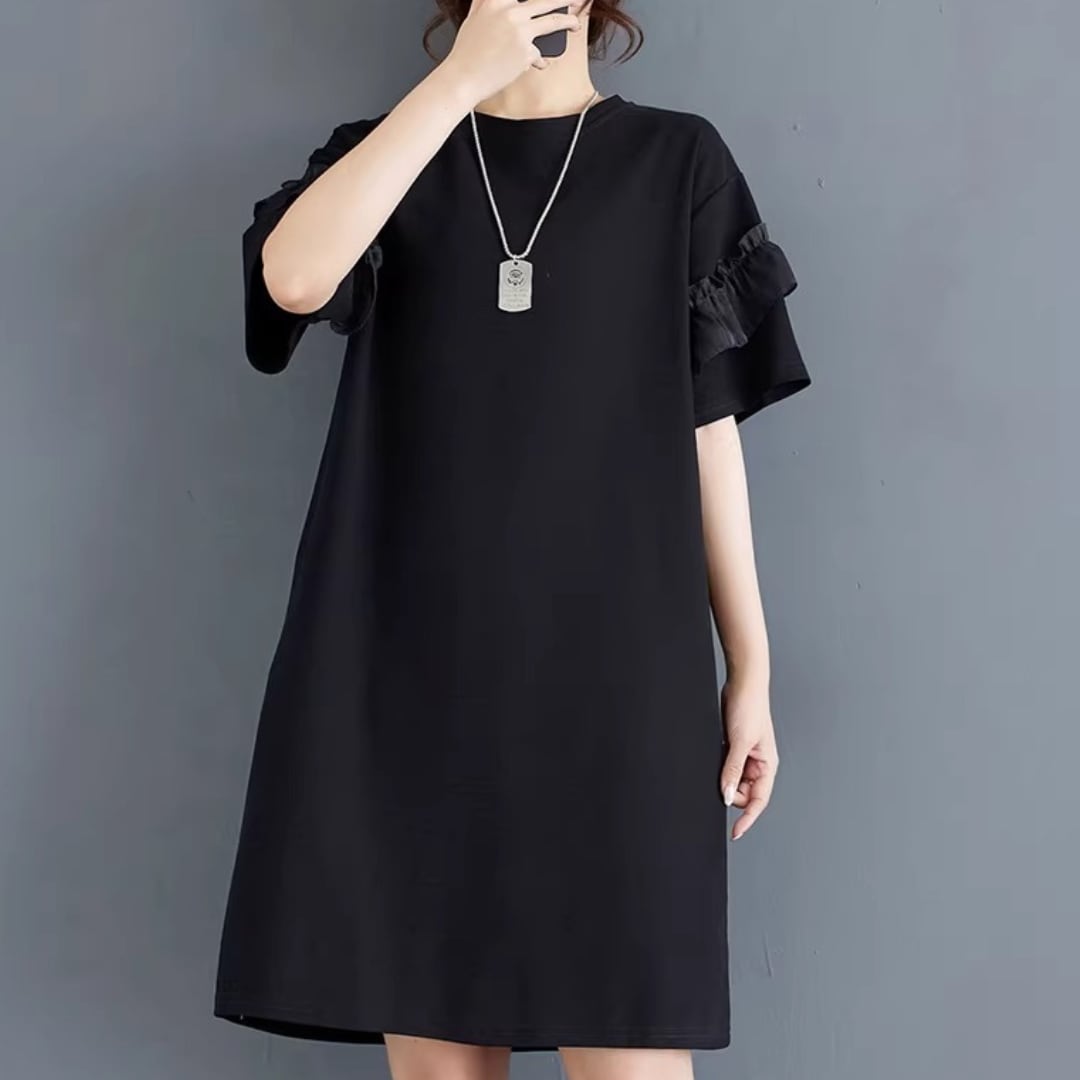 さりげない袖フリルがアクセントになる、シンプルなワンピース。