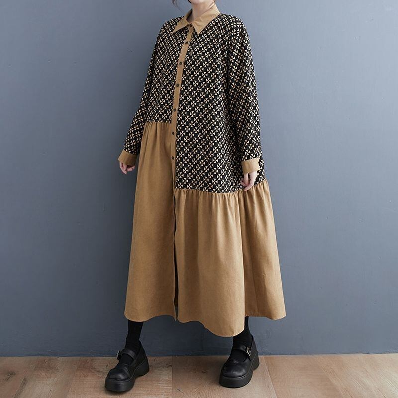 幾何学柄と無地を大胆に切り替えた、目を引く存在感のあるシャツワンピース。