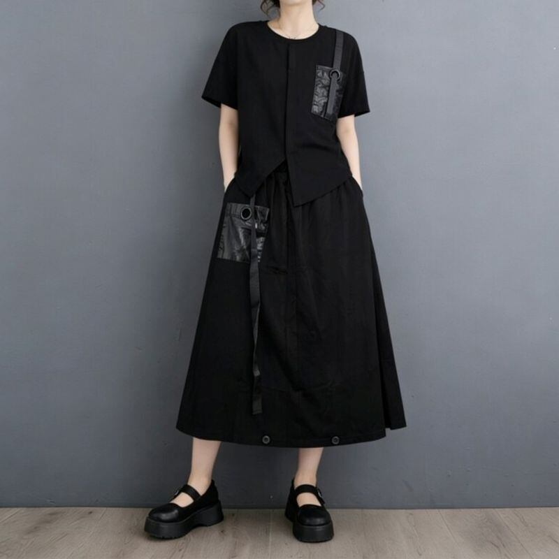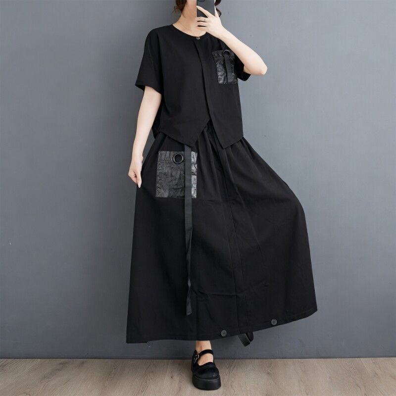 ゆるやかなシルエットと直線的なデザインが組み合わさり、抜け感のあるモードスタイルを演出します。